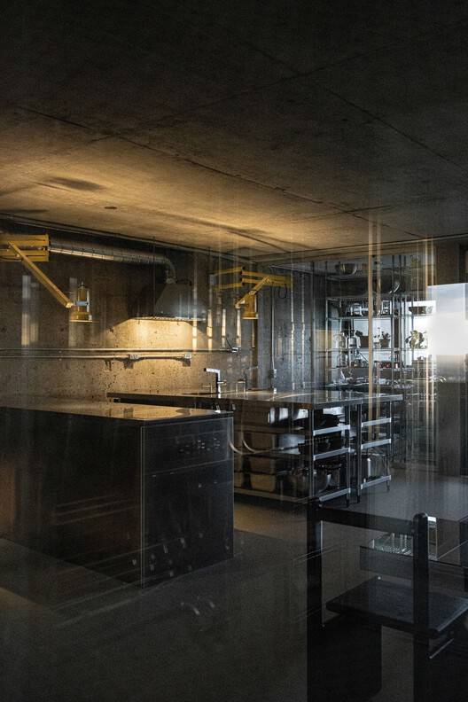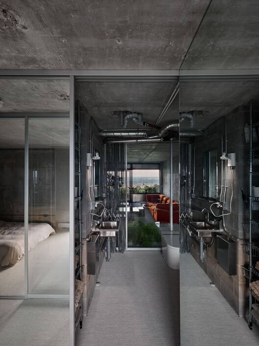 光线、反射与生活美学:该项目将光线的运用提升到了艺术的高度,通过光线的反射和折射,营造出动态而富有变化的光影效果,使得整个空间充满活力。建筑师巧妙地利用了各种反射、透明和金属表面,创造出丰富的光影层次,仿佛在空间中雕琢着光与影的舞蹈。此外,项目对生活美学的表达也颇具特色。工业元素的融入,例如卸货码头灯和餐厅家具,与各种玻璃瓶、模型等物品的陈设,共同营造出一种兼具实验性与生活气息的空间氛围。这种将实用功能与审美体验完美融合的设计,体现了建筑师对生活和艺术的深刻理解和独到见解,使得整个项目更具艺术感染力。