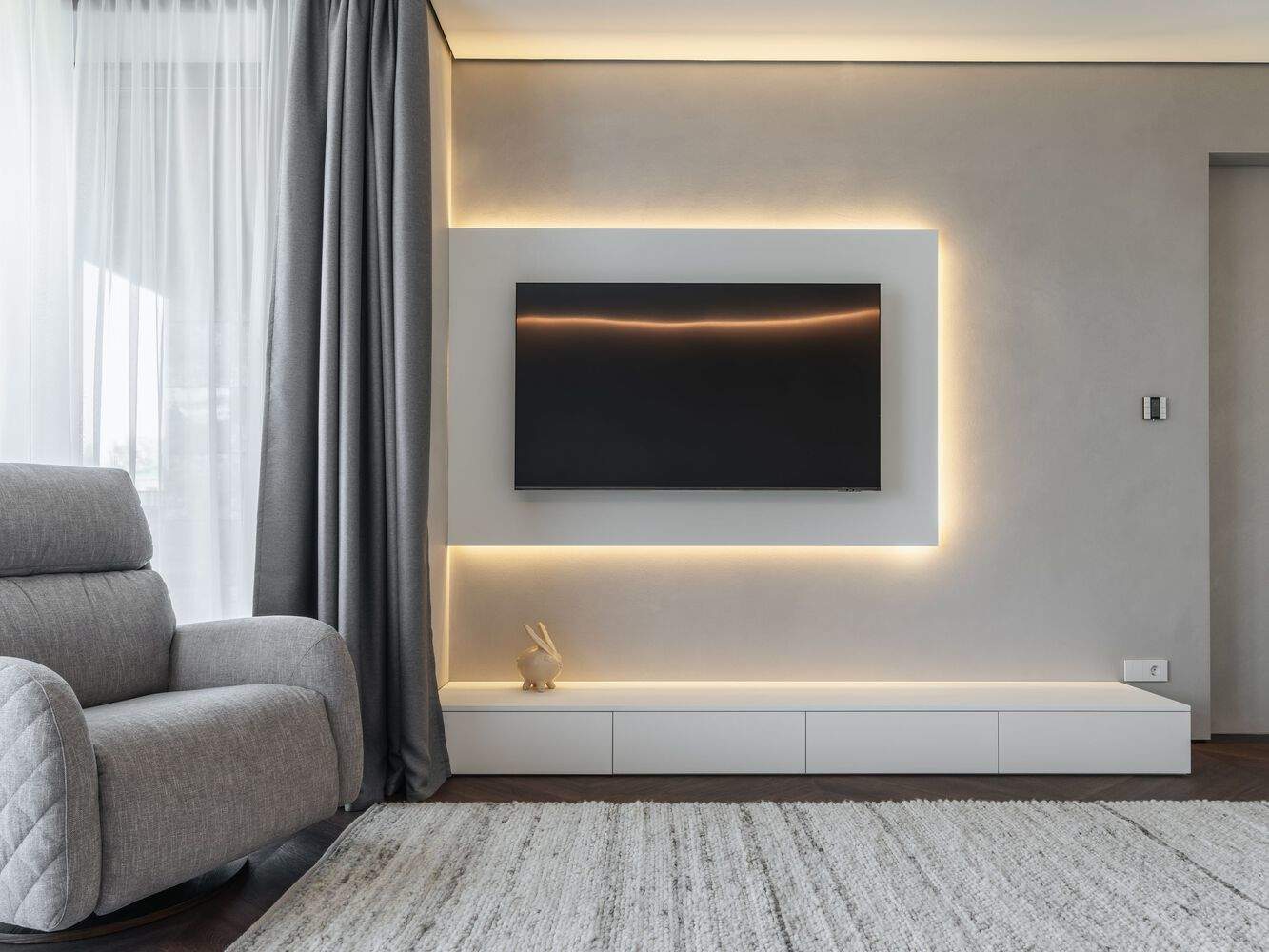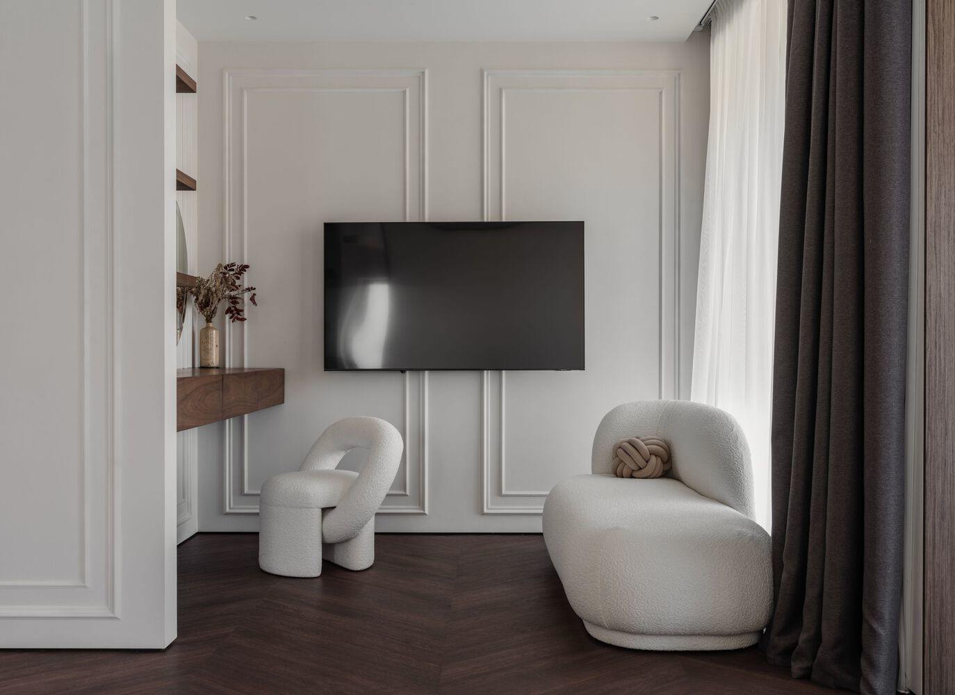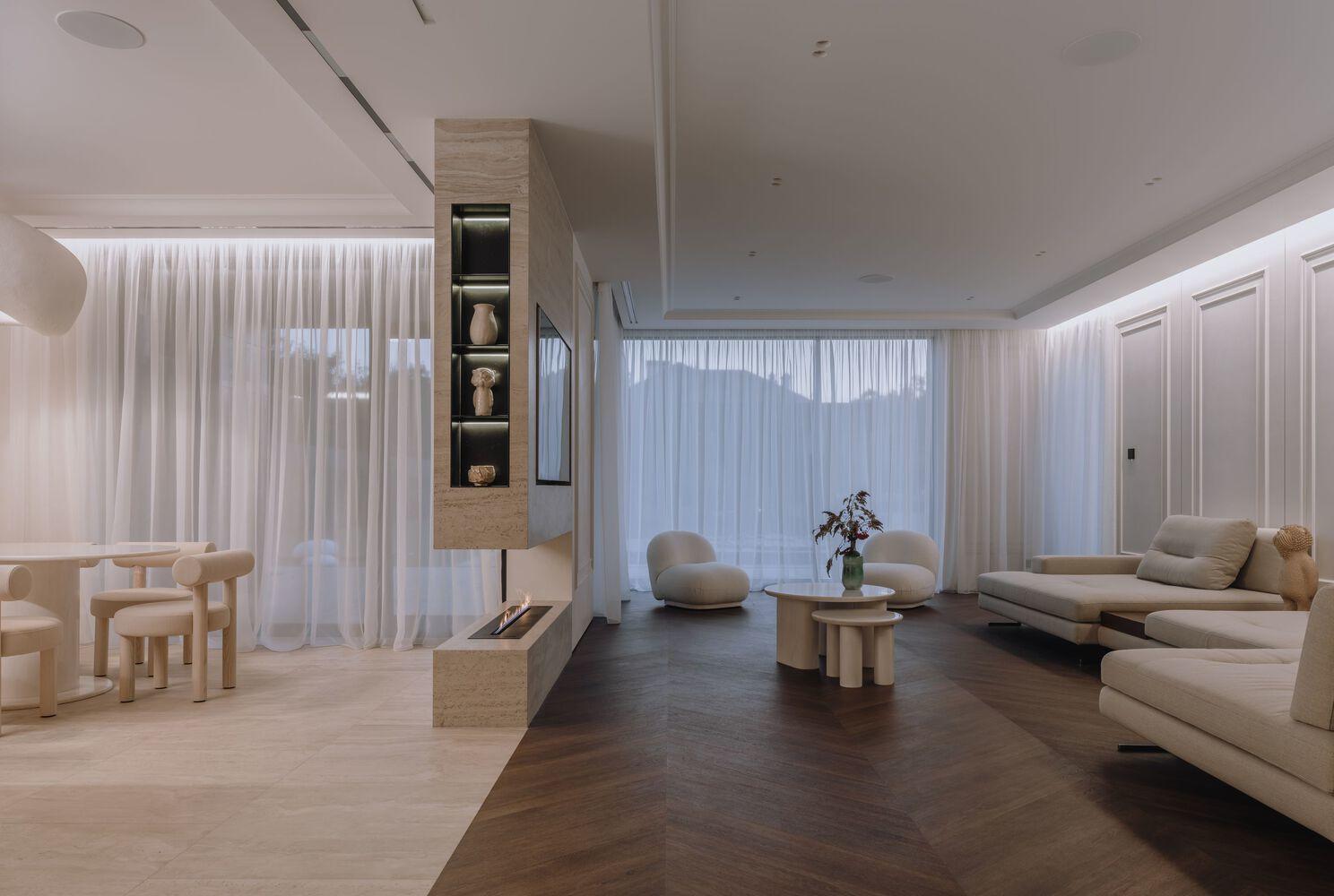 The living room is separated from the kitchen by a porcelain stoneware partition with a bio fireplace and a built-in TV. The small coffee tables here are relatives of the large stone one from the kitchen, as well as the rounded white furniture, is a continuation of the previous concept. The walls of the room are decorated with panels with moldings and backlighting in a calm light palette. All this creates the feeling of an exquisitely cozy house of the classic "golden" era but in a modern minimalist way. A cinema is the dream of every family in their nest - soundproofing on the walls and ceiling, soft surfaces, carpeting, automatic curtains, and built-in five-channel sound.