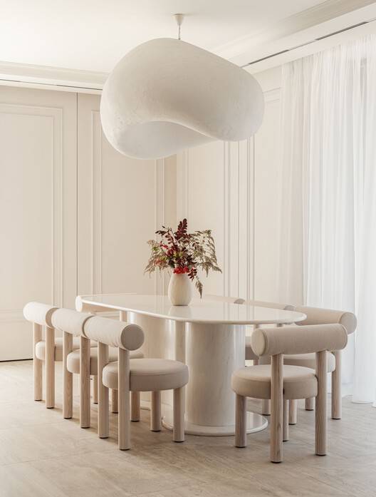 材料与细节的匠心独运:项目的另一大亮点在于对材料的精选和细节的极致追求。瓷石、定制石材、铜型材、织物面板等不同材质的巧妙运用,赋予了空间丰富的质感和层次。例如,厨房的瓷砖岛、客厅的生物壁炉、卧室的织物墙面,都体现了设计师对美学和舒适度的双重考量。此外,照明设计也是一个关键要素,明亮的灯光、精致的灯具,如Khmara灯和Pita灯,不仅提升了空间的亮度,更营造出温馨浪漫的氛围,充分展现了设计师对光线运用的独到见解。