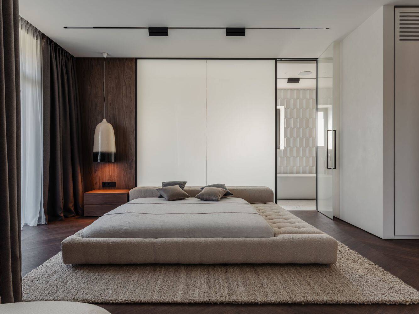 This space is conventionally divided into three zones: Recreation - a custom boucle sofa, veneer and artistic plaster on the walls, and panoramic windows with access to the terrace. The room is decorated with a Lakuna ceramic lamp, decorated with exclusive artistic watering. Bathroom - separated from the main area by smart glass with transparent and frosted modes. Decorated with Mountain ceramic tiles by Makhno and porcelain stoneware panels.