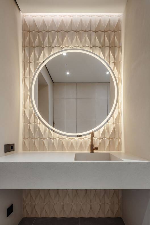 All metal plumbing and accessories have copper plating, which adds a classic context - from ancient Rome to the modern "Old Money" style. Makeup Area - located at the end of the bedroom and decorated with a veneer tabletop, combined with soft, loose rounded furniture and a "Roman" mirror with golden lighting. The wardrobe is connected to the bedroom, it is entirely made of wood. The storage system here combines many adaptive compartments and movable shelves with lighting and the toilets are similar on both floors, but one of them is decorated with our 3D artistic Wind tiles.