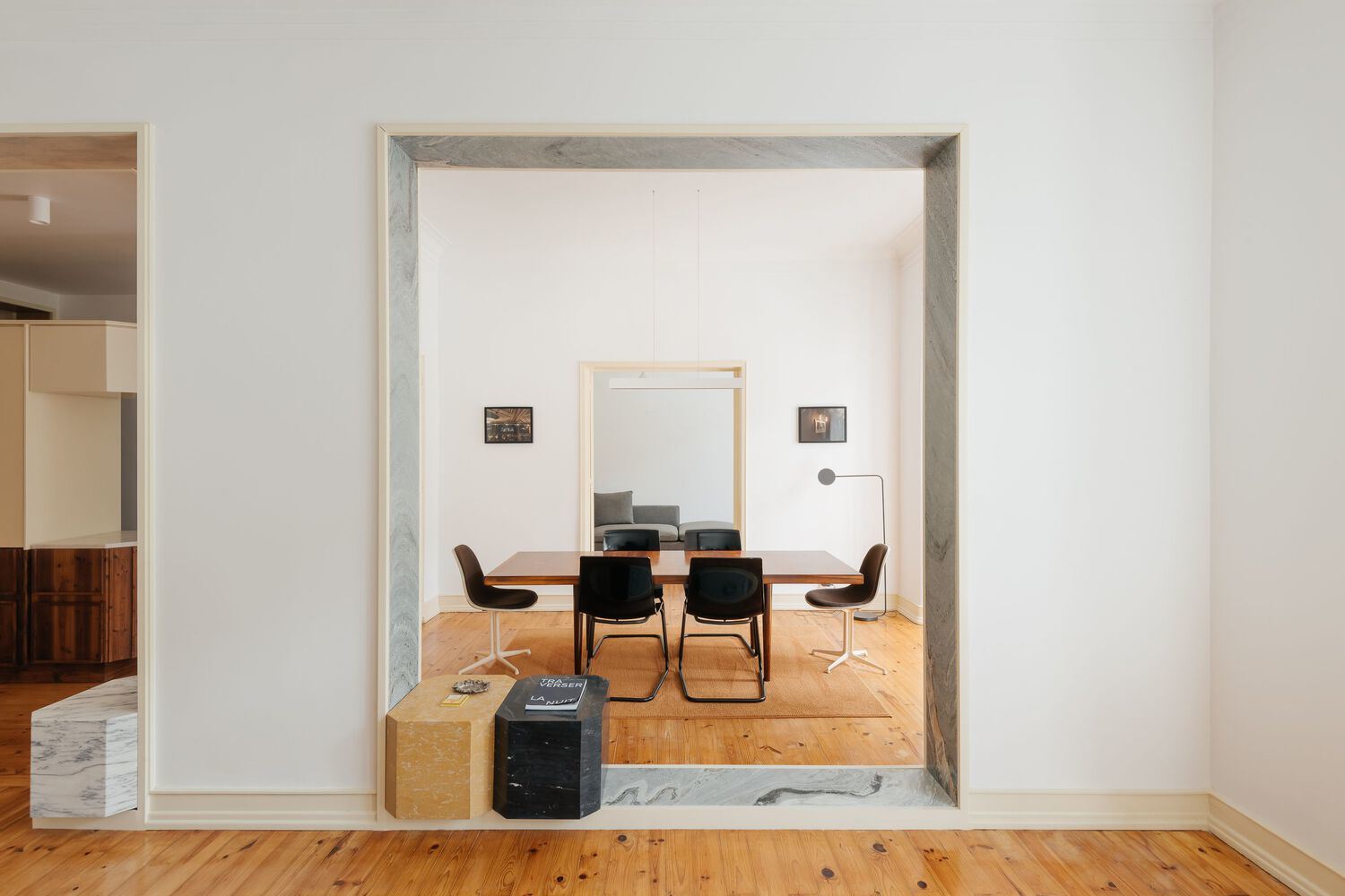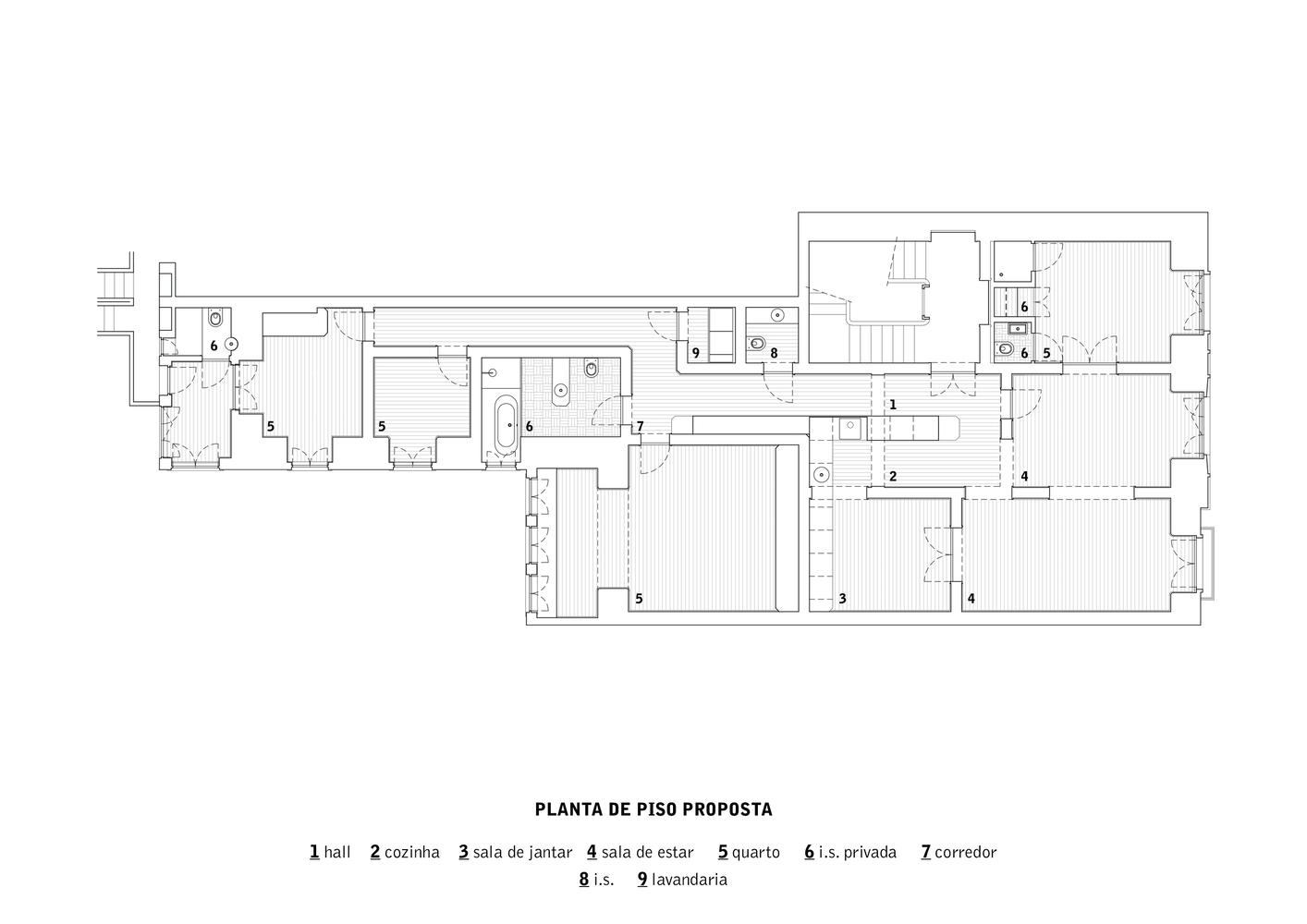 This is an apartment renovation project in a traditional Lisbon building from the 1950s and 1960s, known as "rabo de bacalhau" (codfish tail). A great compartmentalization and a large distance between the kitchen and the social areas of the house characterize this typology.