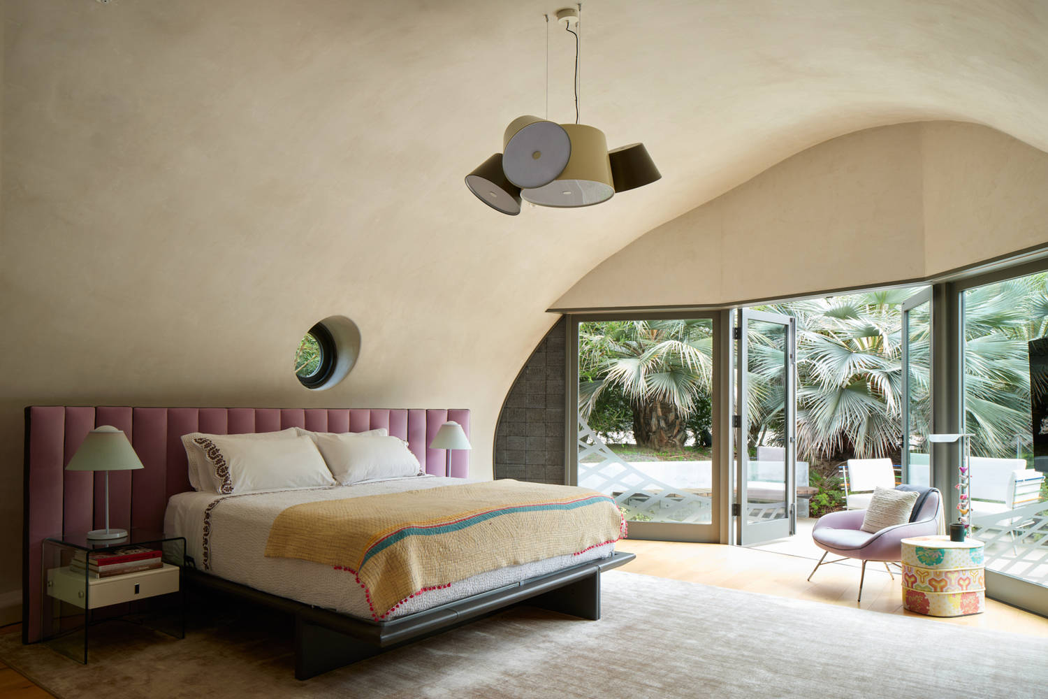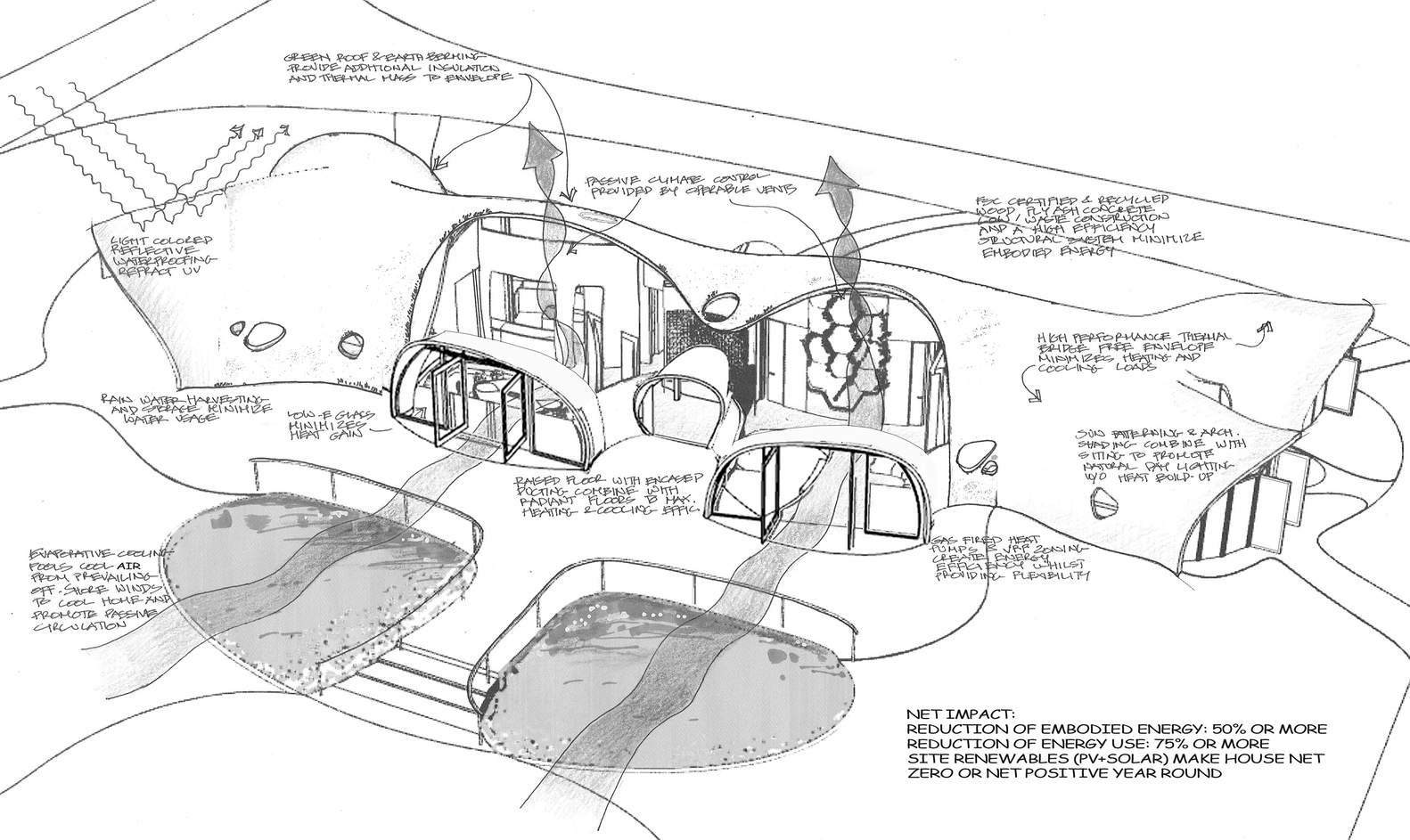 The dual-curvature, monolithic building envelope is much safer and more resilient than traditional envelopes. It carries dead and live loads efficiently and transfers them elegantly along its entire perimeter to the foundation. The building shell is self-supporting, eliminating the need for columns or bearing walls and allowing total flexibility to design and evolve the interior. It is made up of low-carbon geopolymer concrete and contains less than half the embodied energy of a similarly sized traditional building. The building envelope is also thermal bridge-free and insulated to reduce energy use by as much as 65%. The Shell Home’s high-efficiency envelope, siting, landscape and water elements, natural ventilation, and day-lighting combine with other passive design elements and active systems to further reduce environmental impact.