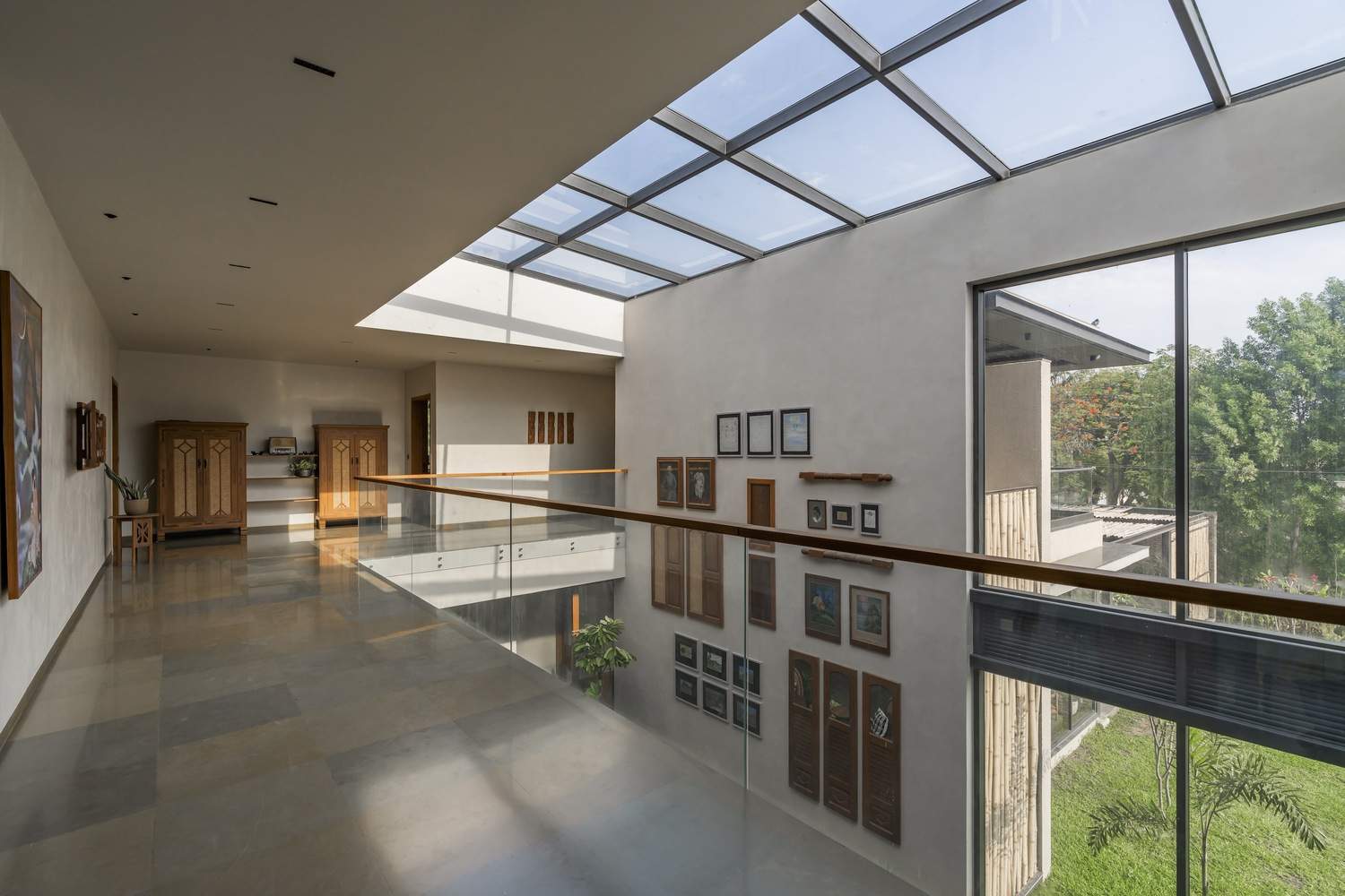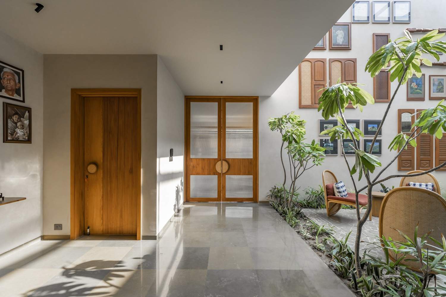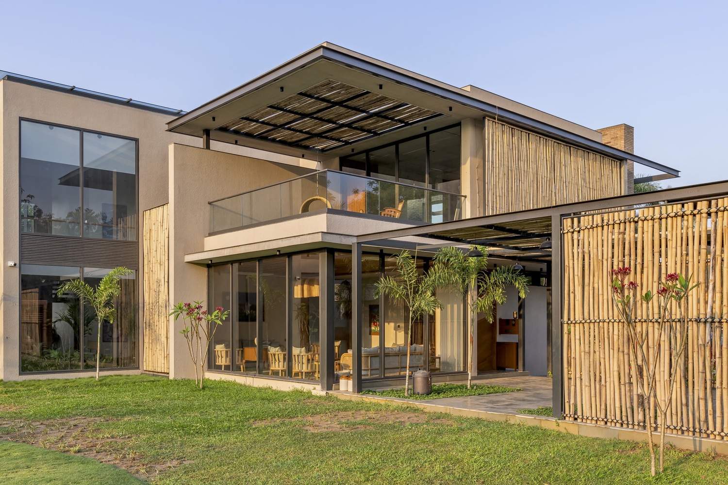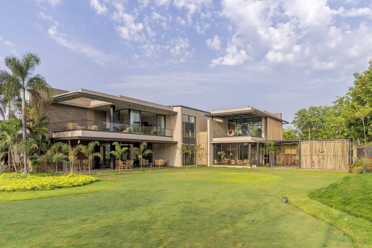 Other rooms include a master bedroom featuring a grand balcony and a children's room adorned with vibrant details contrasting with its subtle interiors. The children’s room gives splashes of green in otherwise subtle and earthy interiors. North-facing rooms house an indoor gym and a yoga terrace, capturing the essence of peaceful living and a seamless aura. The circulation flows around the double-height courtyard, ensuring a continuous visual connection and achieving an ideal harmony between private sanctuaries and shared areas within the home. The house underlines creativity in a cost-effective and ecological design through reclamation and upcycling old wood into new furniture pieces. The overall materiality of this project portrays an earthy and unique aesthetic. It has modernity, with a touch of classicality. The major elevation is enhanced by the bamboo screen entrance and a flying girder, whereas the rest aesthetic is proclaimed by wood furniture, brick walls, and the landscape within. The interiors stand out by the cane and warm lighting with neutral plastered walls.