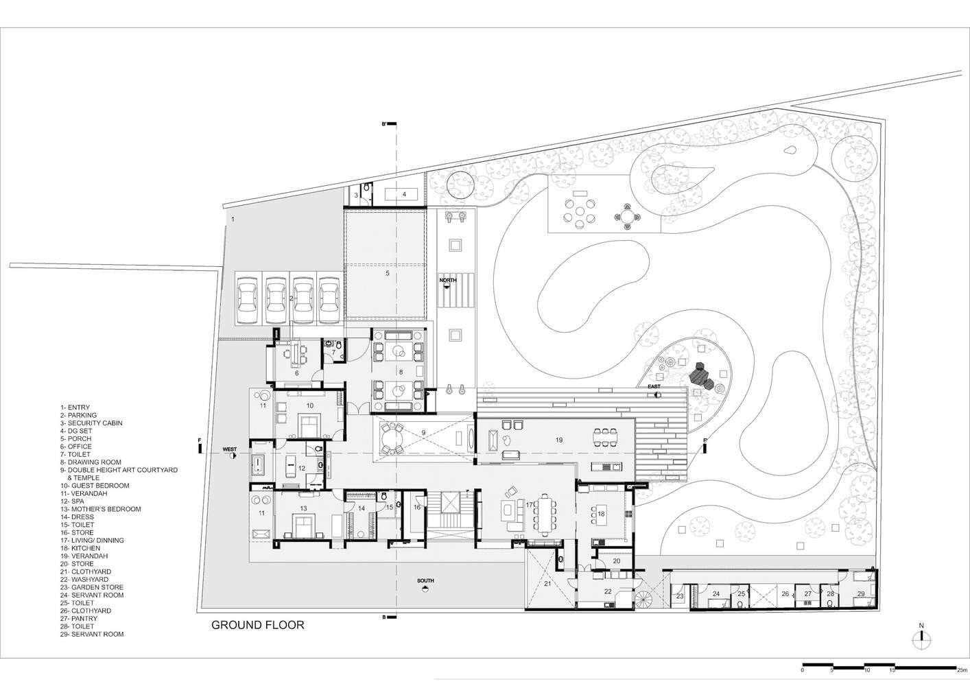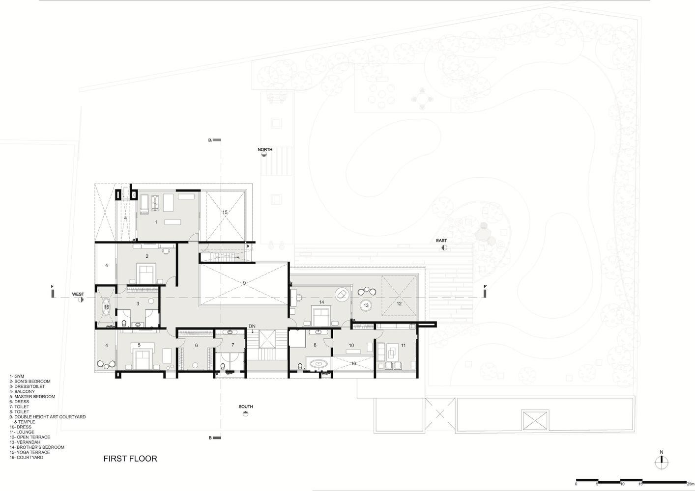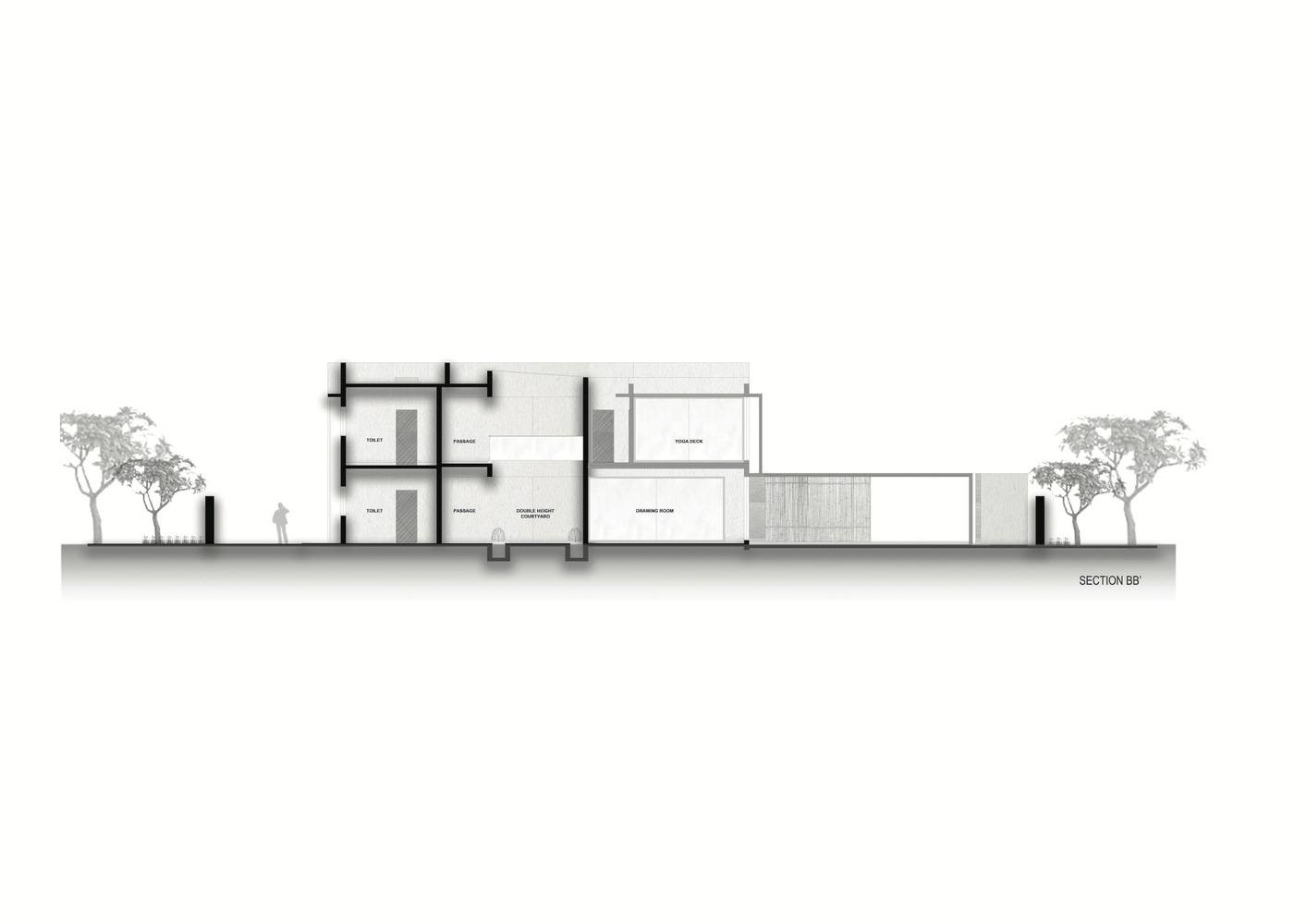 这座豪宅的朝向旨在反映乡土美学。该地块经过精心设计,具有多孔性,向各个方向开放各种景观。北立面和东立面前面有一片全景开阔的草坪,而西面则面向一个亲密的后院空间。在为服务区提供住房的同时,通过最小的开口来缓解南部的酷热。任何建筑对该遗址的反应都标志着它的生态地标。一个面向东北的体量被设计成在吸收充足的自然光的同时,减轻艾哈迈达巴德南部的阳光,为建筑增添价值。