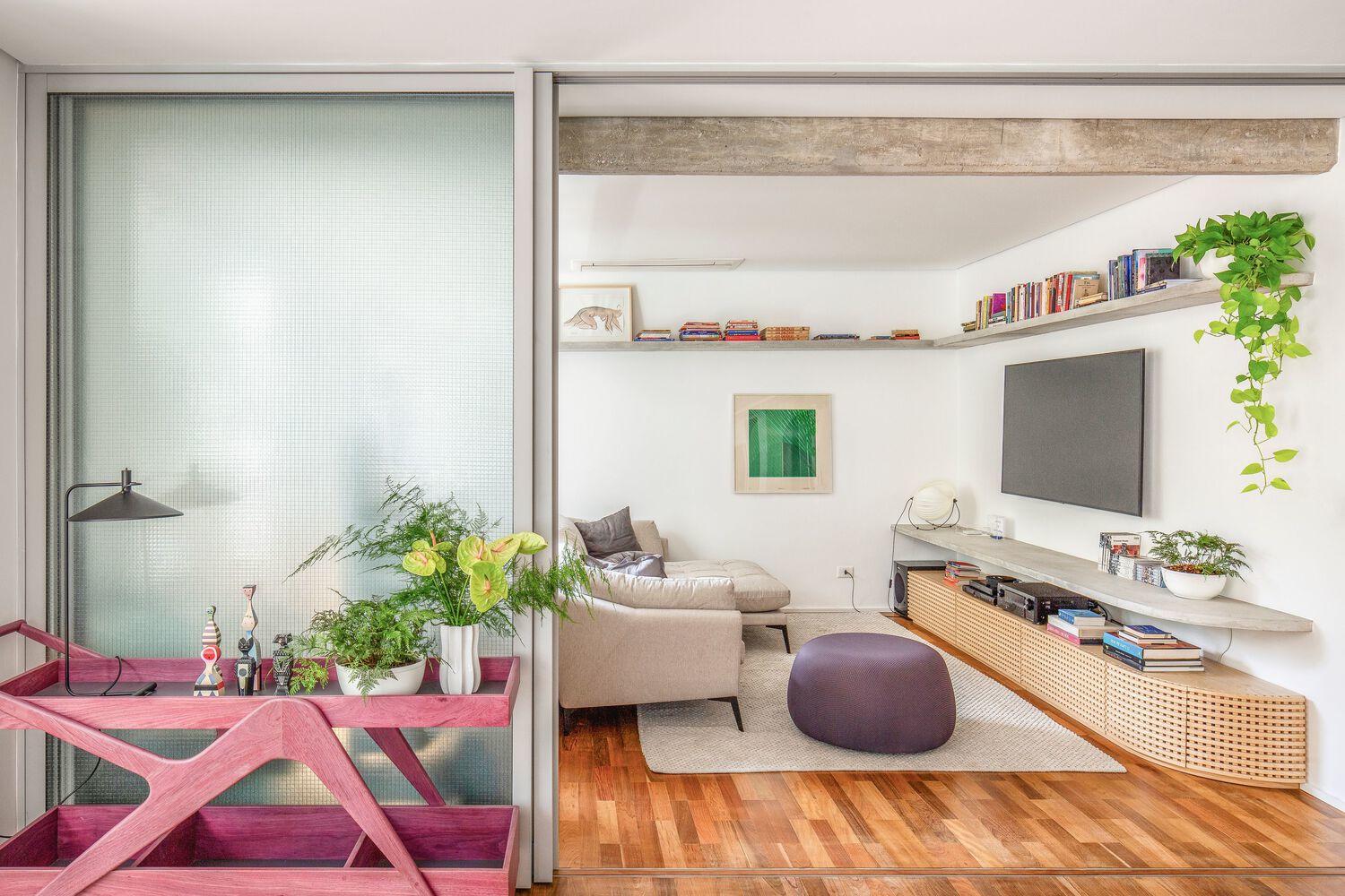 Sliding doors with wired glass separate the office from the living room and the kitchen from the service area, allowing natural light to pass between the spaces. The original wooden flooring in the living area and bedrooms was restored, and a wooden deck was installed over the balcony floor.