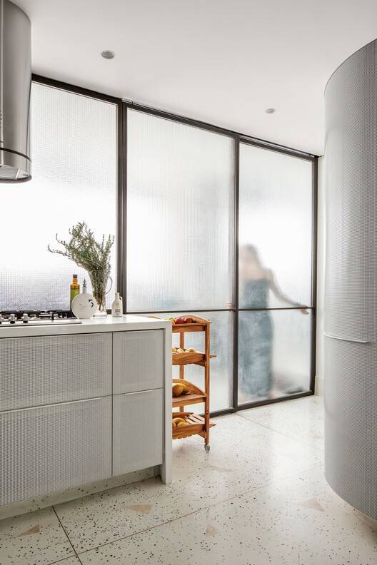 带金属丝玻璃的滑动门将办公室与客厅隔开,将厨房与服务区隔开,让自然光在空间之间穿过。客厅和卧室的原始木地板被修复,阳台地板上安装了一个木甲板。