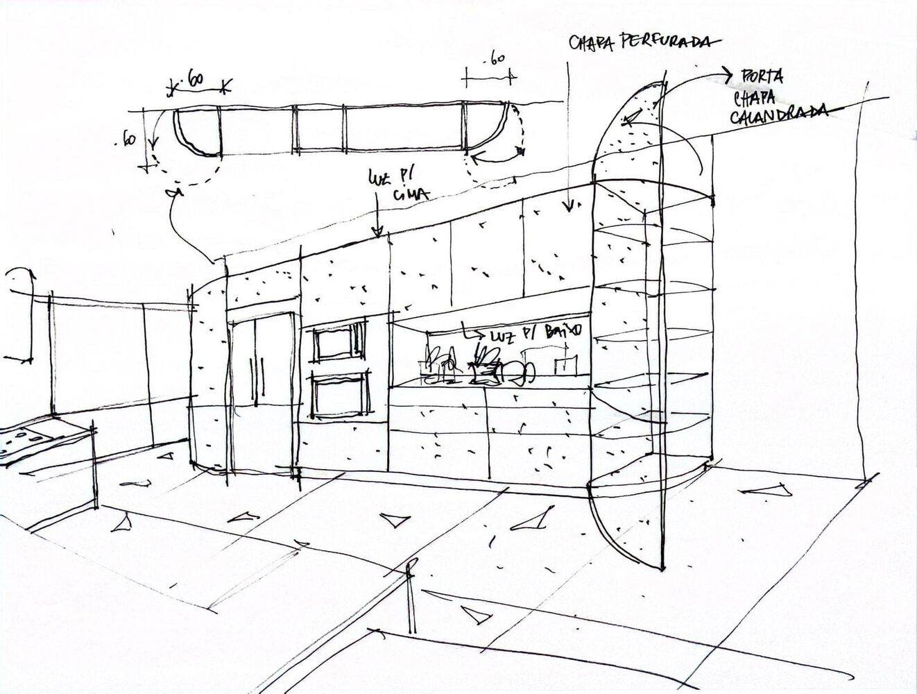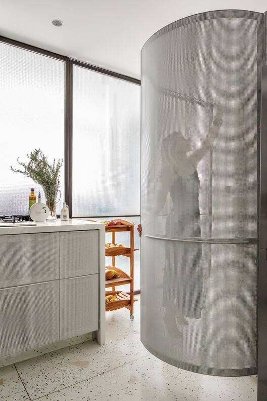 厨房是一个挑战。它几乎没有自然光,而且由于多个接入点,流通占用了太多的空间。为了满足居民的需求,设计了一个弯曲的橱柜,允许流体流通和充足的存储空间,由穿孔和轧制的金属板制成,用于存放电器和照明壁龛。厨房餐桌由混凝土制成,也在现场模制,悬垂高度为1.40米。