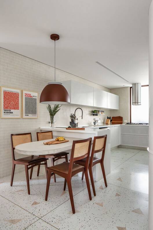 光线与功能的平衡:对于光线的运用是这个项目的另一大亮点。设计师巧妙地利用了滑动门和有线玻璃,将办公室与客厅、厨房与服务区分隔,保证了各个空间之间的连通性,同时也让自然光能够自由穿梭于各个区域,使整个公寓更加明亮和通透。特别是针对厨房区域光线不足的挑战,设计师设计了弯曲的橱柜,不仅提供了充足的存储空间,也优化了流通,克服了原有空间结构的限制。整个项目在满足功能需求的同时,也兼顾了美学上的平衡,每个细节都经过精心考量,体现了设计师对居住品质的极致追求。此外,巴西设计师家具的选择也为空间增添了独特的文化氛围。