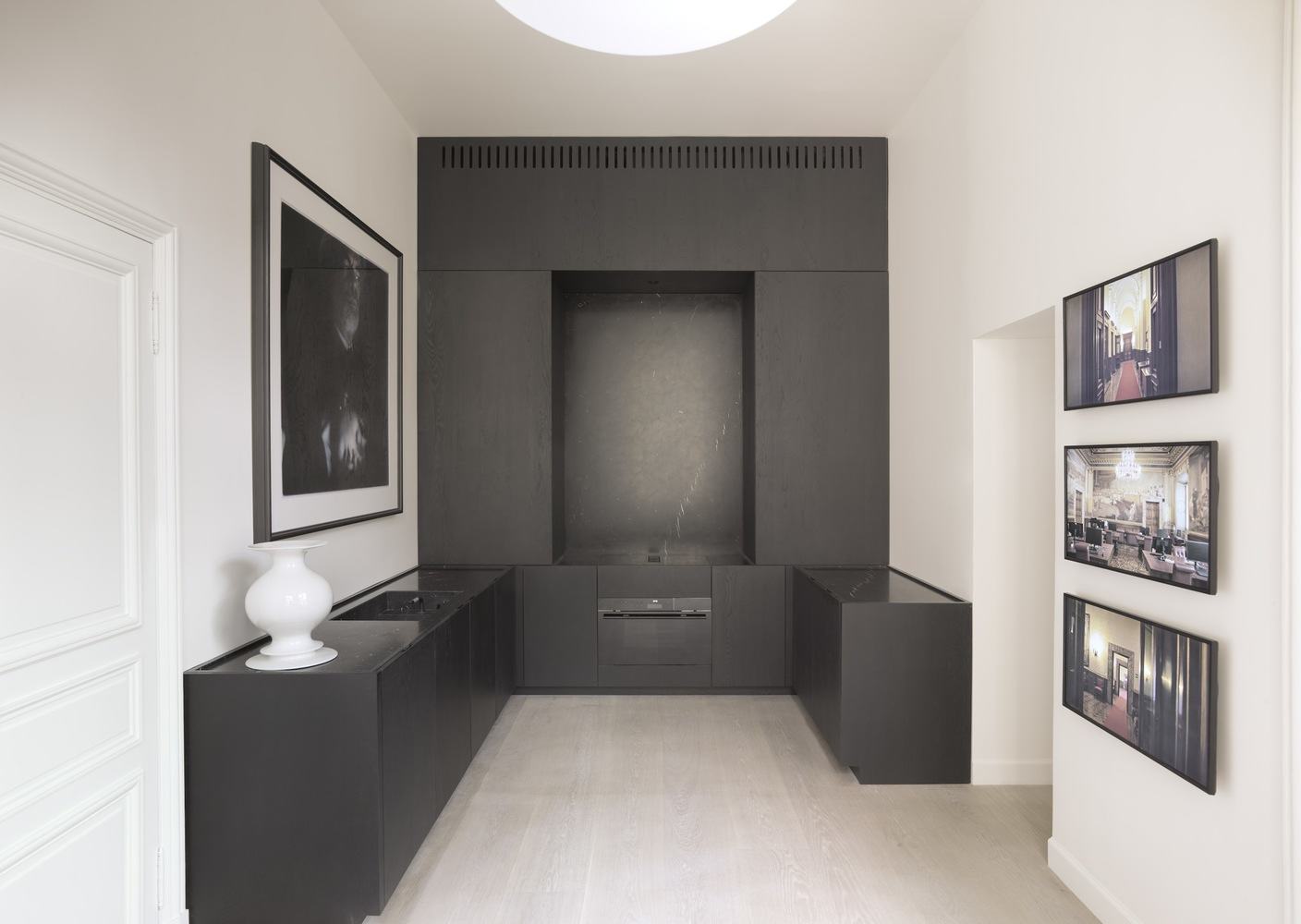厨房采用黑色木材和nero marquina大理石,展现出大胆而现代的风格。隐蔽的细节和集成的电器产生了一种几何雕塑感,强调了中心和对称的壁龛。一个非正式的用餐区和框架艺术品使空间更加完整。