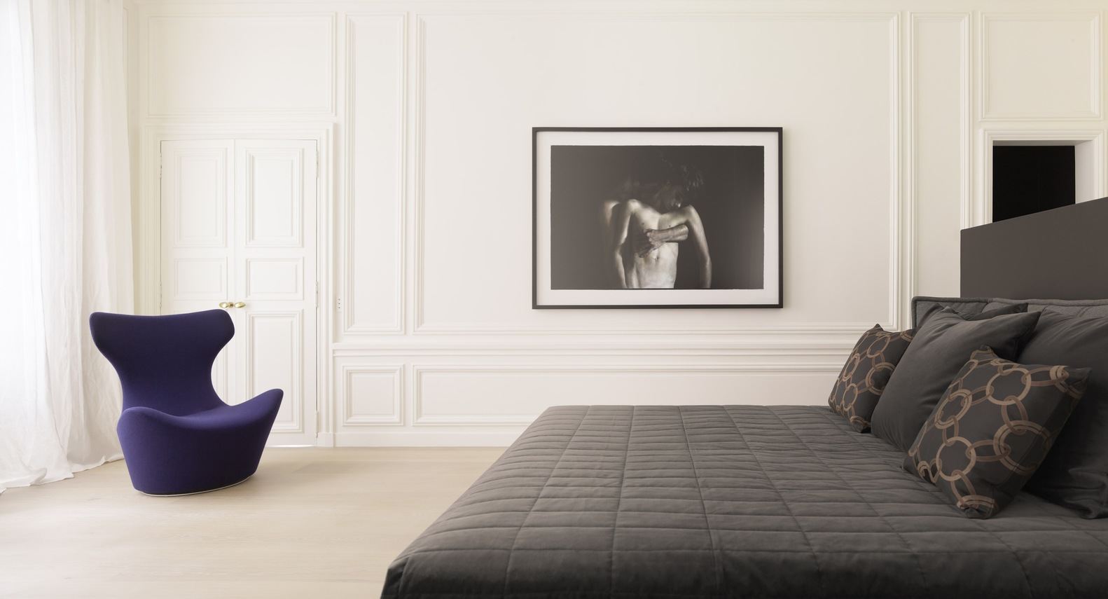 这间书房用木炭粉刷,配有木炭家具,在正式客厅和主卧室之间的过渡中提供了短暂的停顿。黑暗空间的视觉亲密感为主卧室提供了一定程度的隐私,并充当了一个非正式的休息区。
