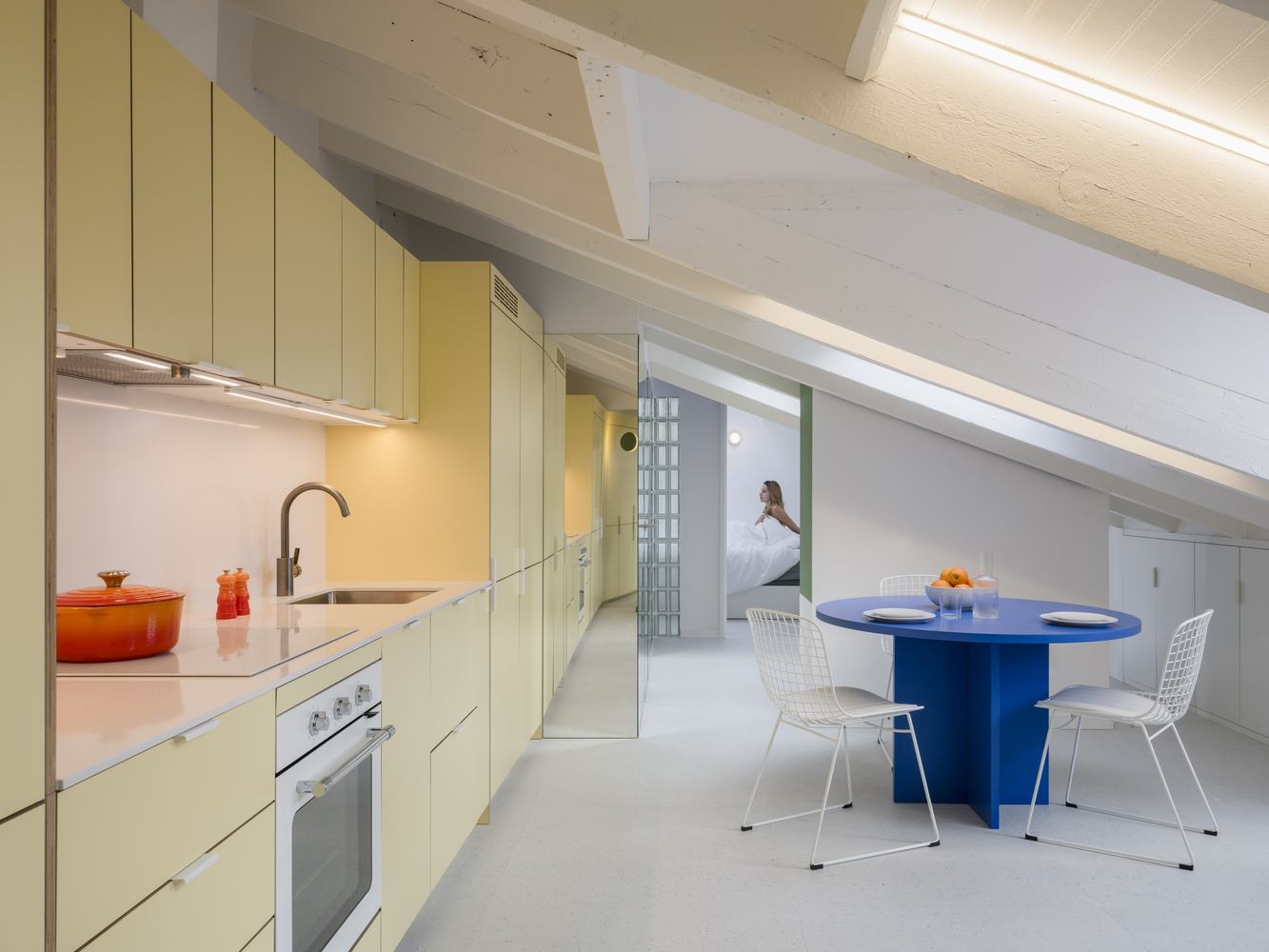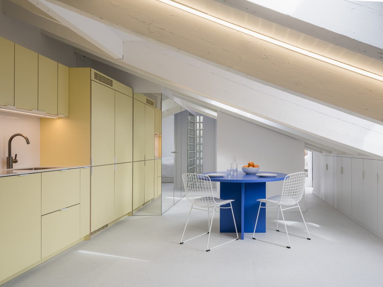 光线和材料的巧妙运用:光线是这个项目的灵魂。建筑师巧妙地利用现有和新增的屋顶窗户,以及透明的入口门,最大限度地引入自然光。浴室的玻璃墙设计,既保证了隐私,又能将光线引入。厨房的超哑光黄色墙面,在视觉上增加了空间的亮度。镜面柜的设计,则通过反射和折射,营造出更加开阔的空间感。这些对于光线和材料的巧妙运用,不仅提升了居住体验,也赋予了空间独特的个性,展现出建筑师对光影的敏锐感知和对材料质感的精准把握,营造出温馨而富有现代感的生活氛围。