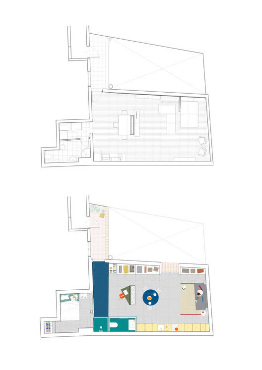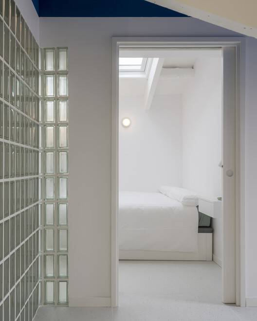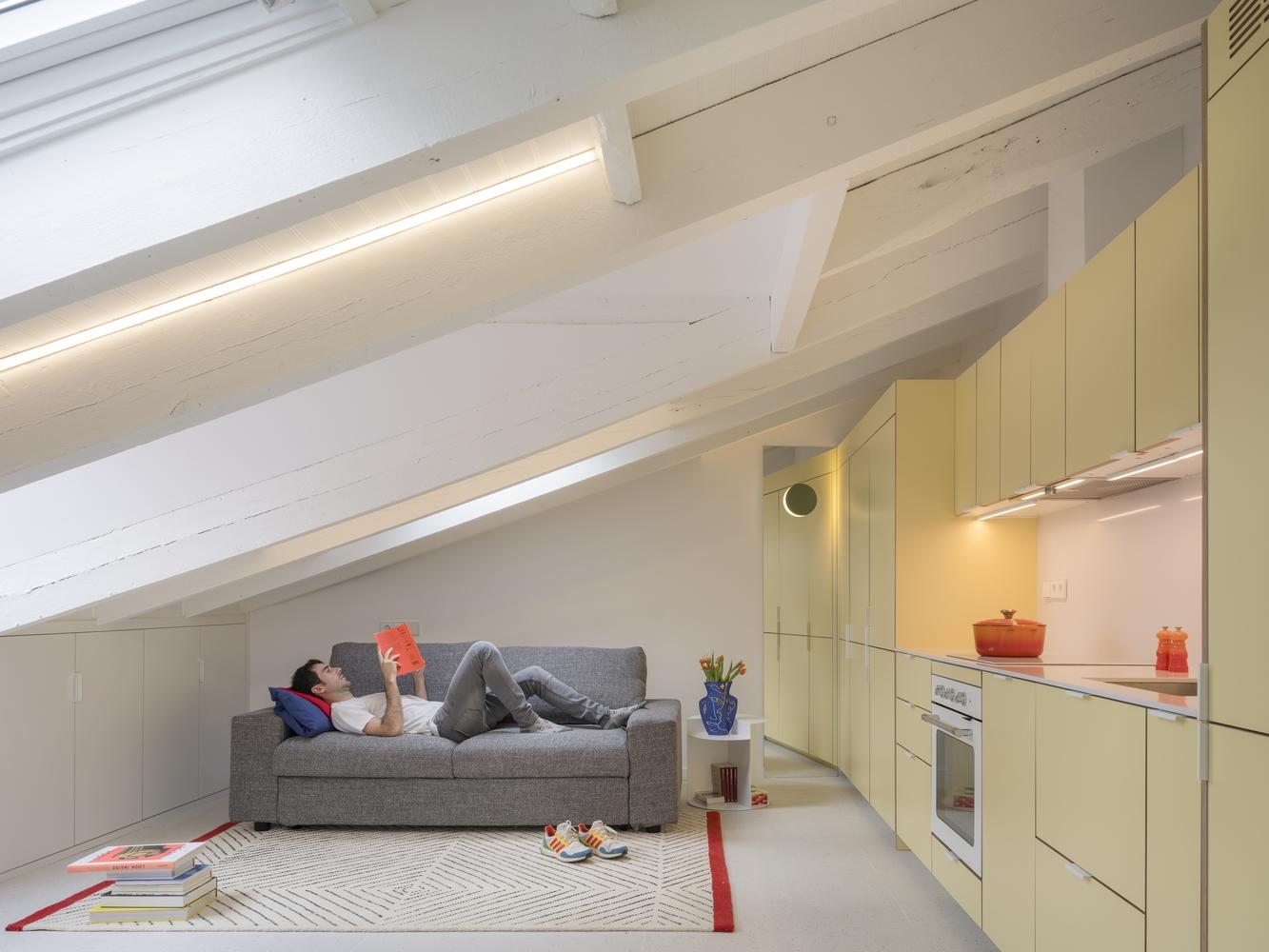 The spatial configuration of the attic, very different from the rest of the building floors, responds to urban regulations for the top of the building, which generally features sloping roofs and large rooms with few partitions and low height.