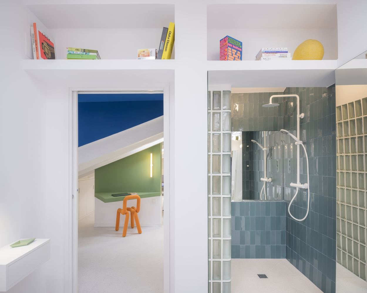 At night, the house transforms. The shower cabin becomes a lantern that illuminates the entire domestic space and, as if it were a scenography from a Wes Anderson movie, the Flix house, with its light furniture and indirect lights, seems to float under a large sloping roof. And so, from the bed, with all the silence and through one of the skylight windows, you can see the iconic Schweppes sign on the Capitol building on Gran Vía that takes us from Madrid to heaven.