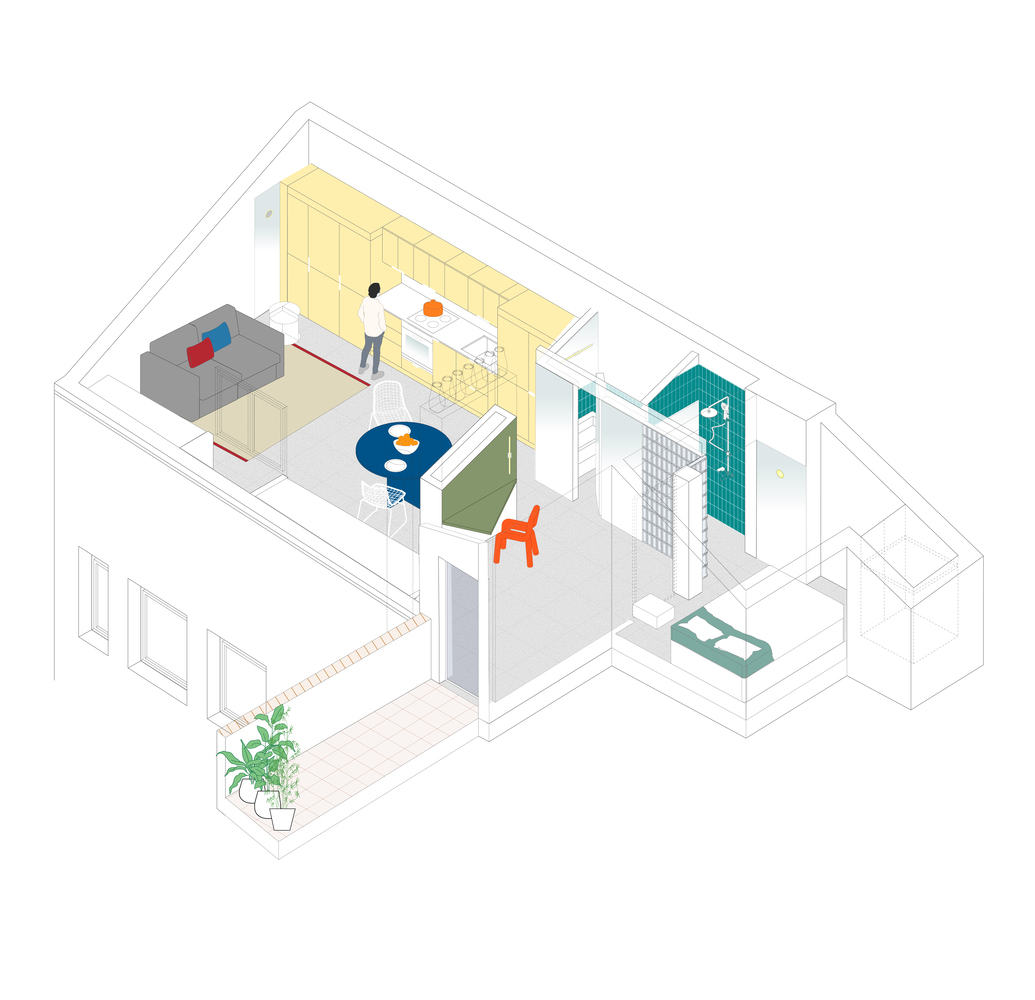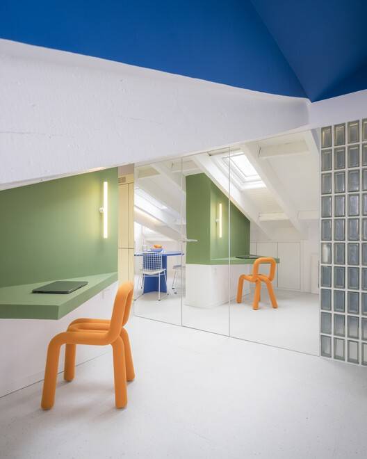 Text description provided by the architects. The current perception of the attics in the city center stands out for their potentially attractive character: they are elevated places, floating above the rooftops, partially visible structures from the street, not easily accessible, and sometimes associated with a bohemian life.