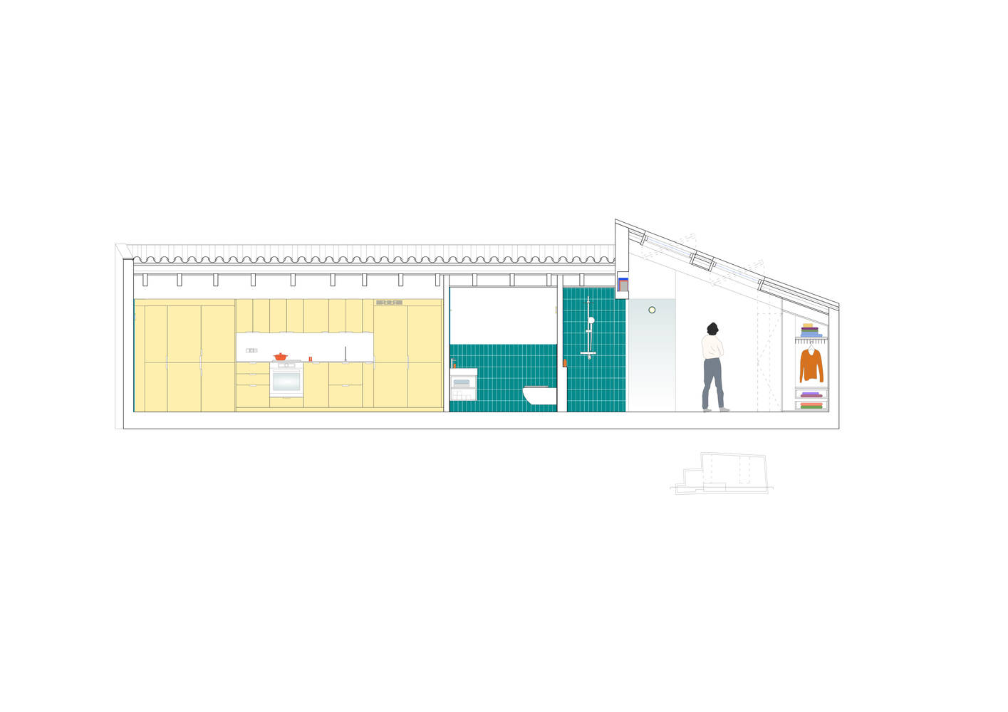 厨房家具设计为长5.5米、宽60厘米、高2.02米的线性结构,体积可达1167立方米,其中大部分房屋的各种物品、清洁用品、厨房用具、电器和衣物都存放在这里;紧凑的层压HPL超哑光黄色淡色墙壁,为房屋最黑暗的部分带来亮度,由家具(包括船体和门)结合而成,采用标准的市场测量方法,降低了建筑成本。