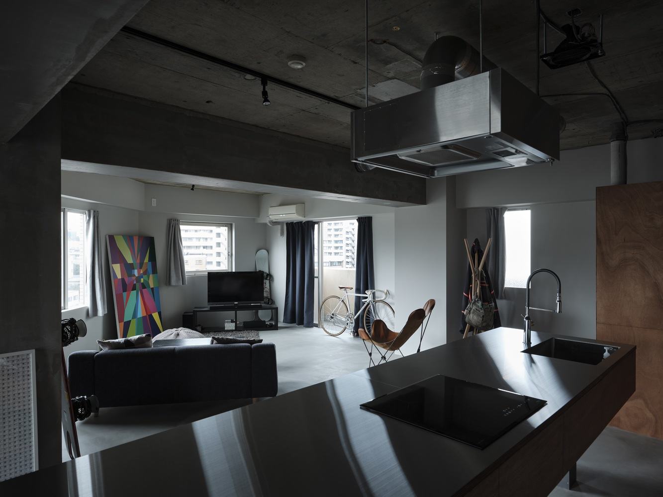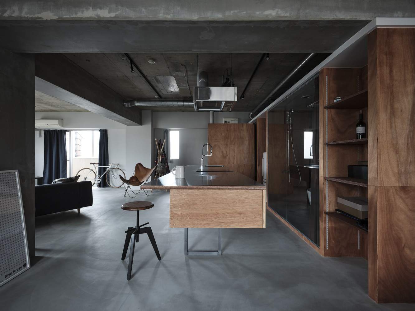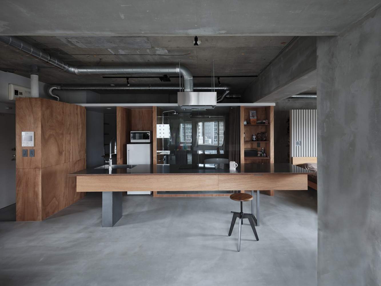 拆除了不必要的私人房间的墙壁,暴露了由此产生的房间中间的柱子和横梁,在一个空间中形成了三个轻轻划分的区域。考虑到公寓中只有一个房间,而且建筑物的结构不能改变,目的是设计可以同时控制和不可以同时控制的东西。