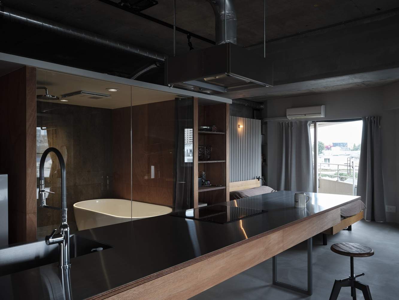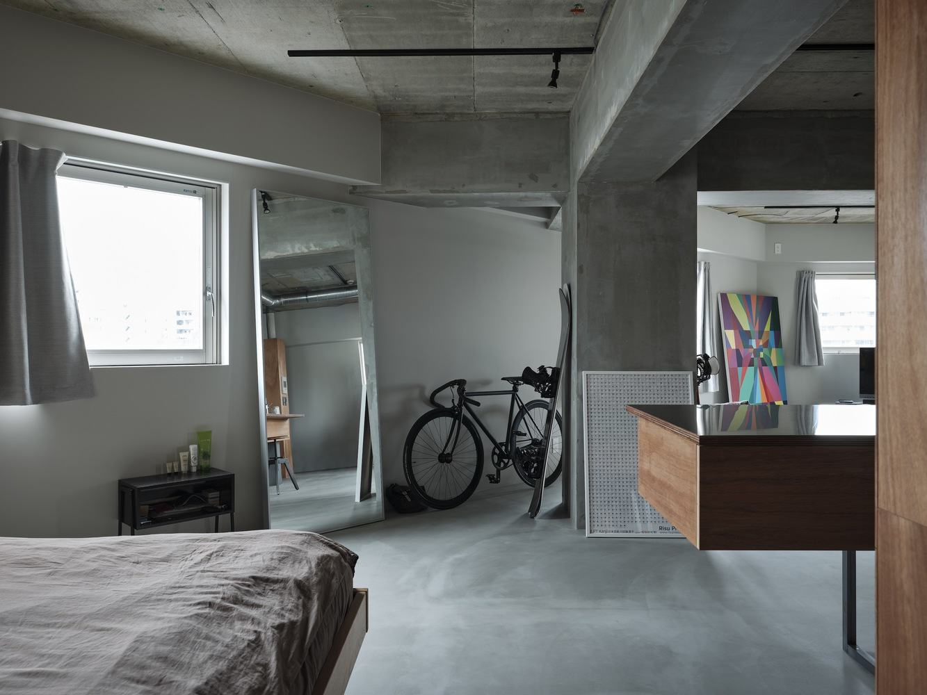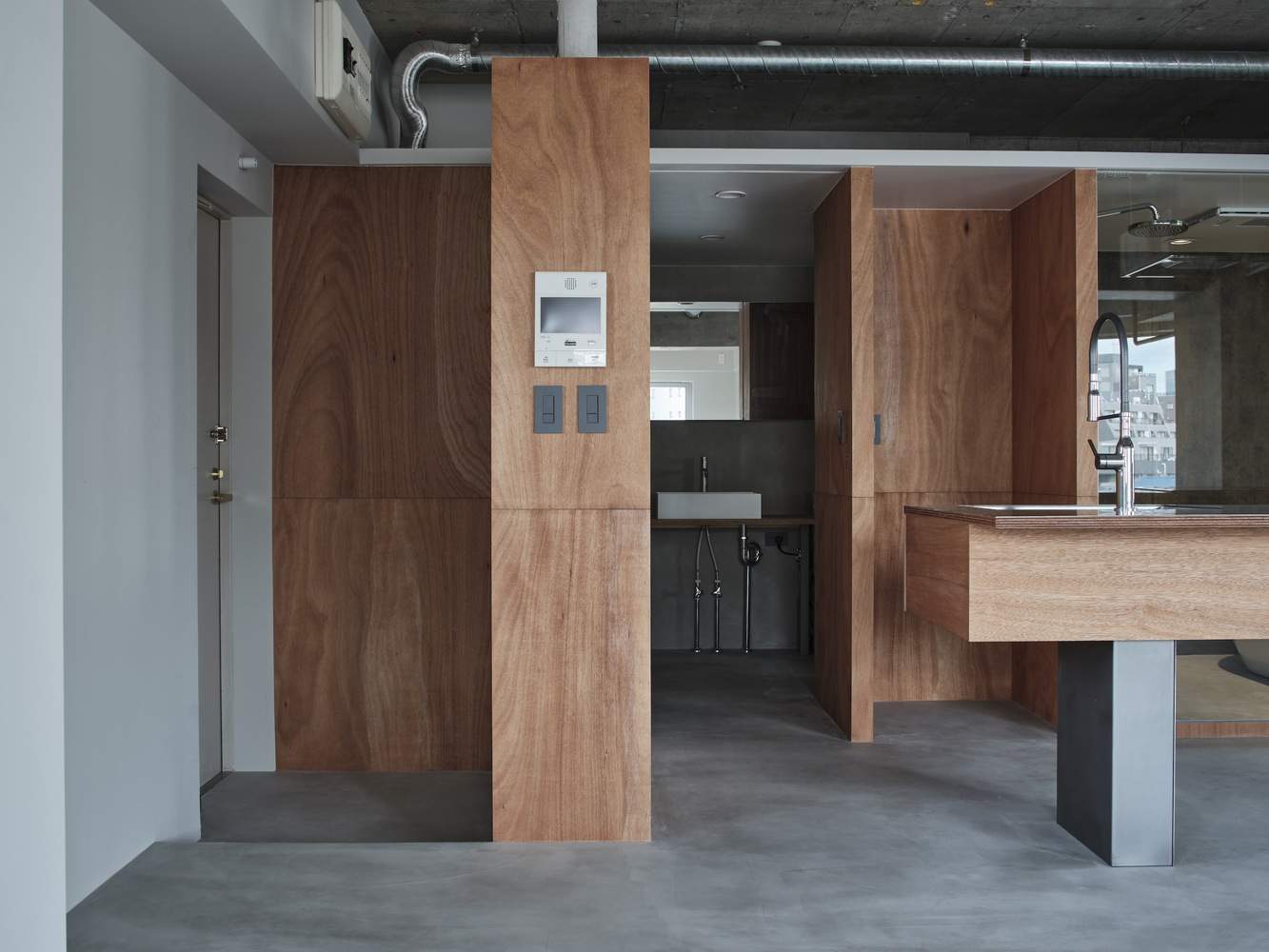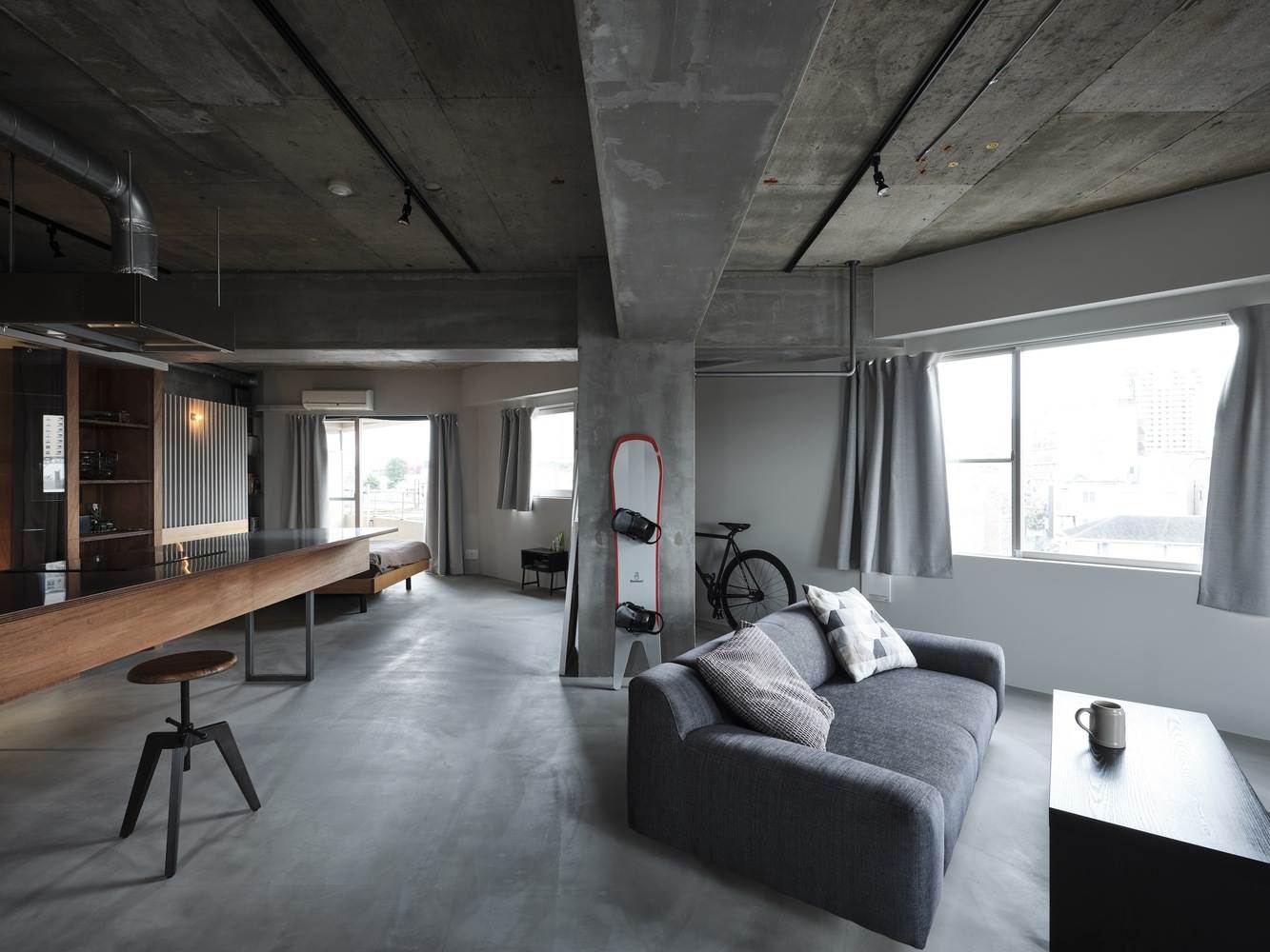 拆除了不必要的私人房间的墙壁,暴露了由此产生的房间中间的柱子和横梁,在一个空间中形成了三个轻轻划分的区域。考虑到公寓中只有一个房间,而且建筑物的结构不能改变,目的是设计可以同时控制和不可以同时控制的东西。