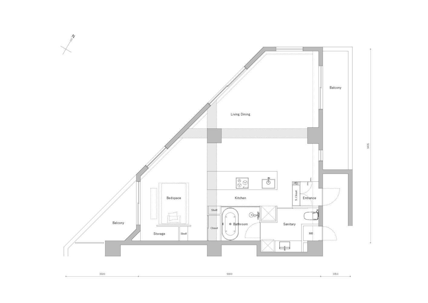 The demolition of the walls of unnecessary private rooms exposed the pillars and beams in the middle of the resulting room, creating three gently divided areas in a single space. Considering the confinement of a single room in an apartment, and the fact that the building’s structure could not be changed, the aim was to design the things that could and could not be controlled at the same time.