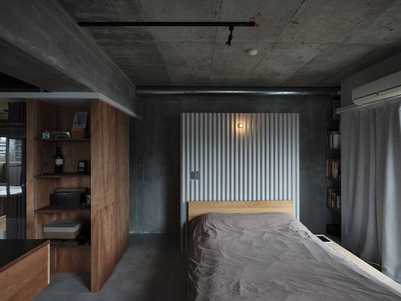 材料与光线的巧妙运用:该项目在材料的选择和光线的运用方面也展现了独特的创造力。项目巧妙地运用了胶合板和砂浆等材料,在不同的功能区域之间创造出视觉上的联系和对比,从而营造出丰富且具有层次感的生活空间。同时,光线的运用也是一个亮点。通过落地窗的设计,将外部的城市景观引入室内,增强了空间与环境的互动。通过对光线和影子的巧妙运用,该项目赋予了空间更多的动态性和表现力,营造出一种明亮、通透而又充满生机的居住氛围。这种光影的变化也让空间随着时间流逝而焕发不同的魅力。
