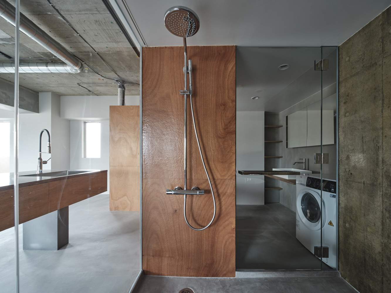 From the entrance, through the kitchen, and up to the bathroom, the lauan plywood and mortar are used in a way that intersects different functions. The glass keeps transmitting and reflecting as time goes by, the furniture acts freely depending on the mood of the day, and the artworks and hobbies scattered around the room add color to the life...