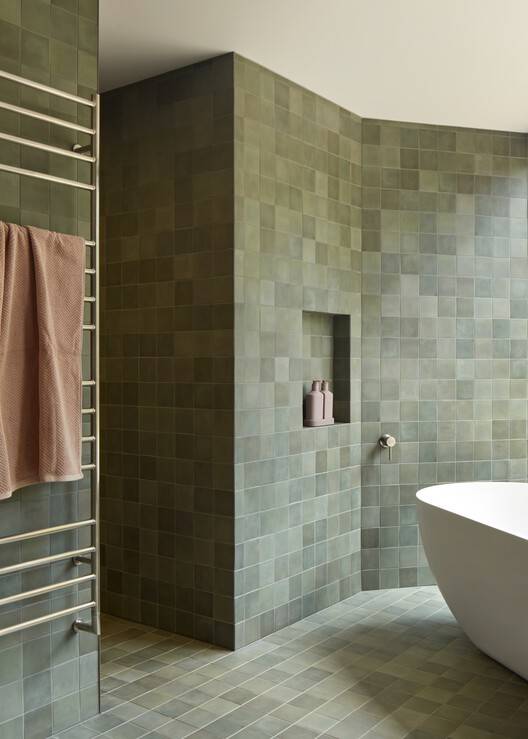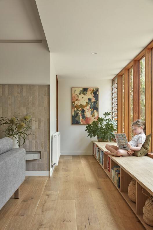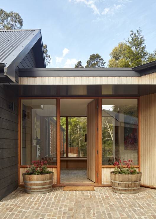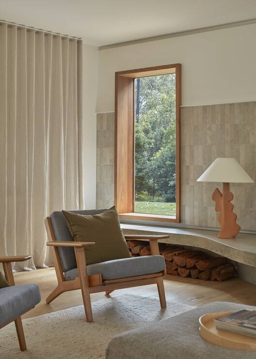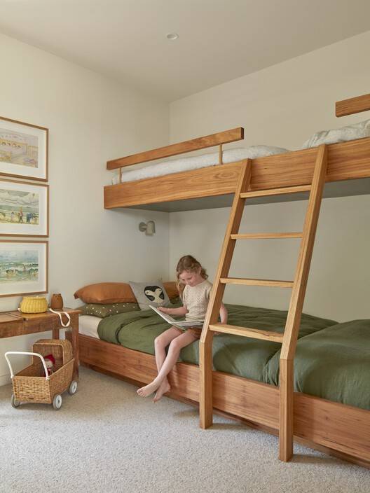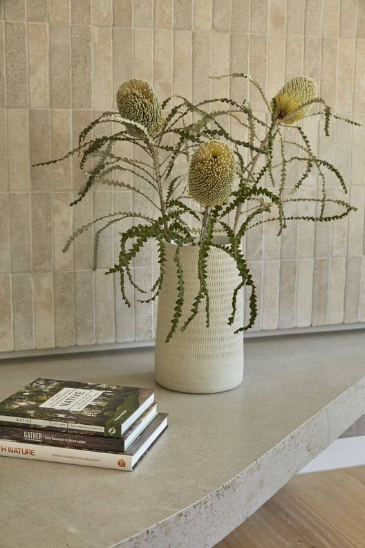 Text description provided by the architects. Marine House represents a moment in time when the world was re-evaluating itself. In late 2020, we were tasked with the project of reimagining a somewhat tired 1980s compact project home into a lockdown and potentially long-term family home for a family of six; we threw ourselves into the romance of all that a bush-inspiredyet sophisticated family home could be.