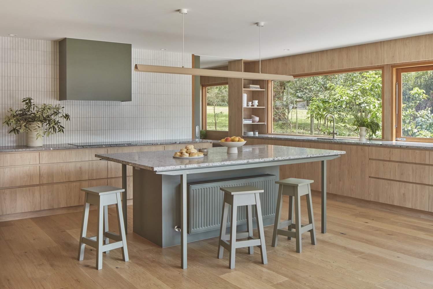 私密而美丽的口香糖衬里环境为轻松有趣的材料调色板提供了背景和灵感。现有的住宅天花板相对较低,在当时是经济适用的。这让我们走上了一条以水平视角为主,以更长、更低的空间为主的道路。儿童卧室的一个大型山墙新翼通过一个低玻璃的“画廊”与原来的房子相连第二个“画廊”大厅位于原建筑的两侧,为主卧室套房创造了一个单独的入口。平面图被比作“风车”,成功地为父母和孩子创造了公共和私人区域以及隔离,同时也利用了在整个场地上开辟多个景观的优势。