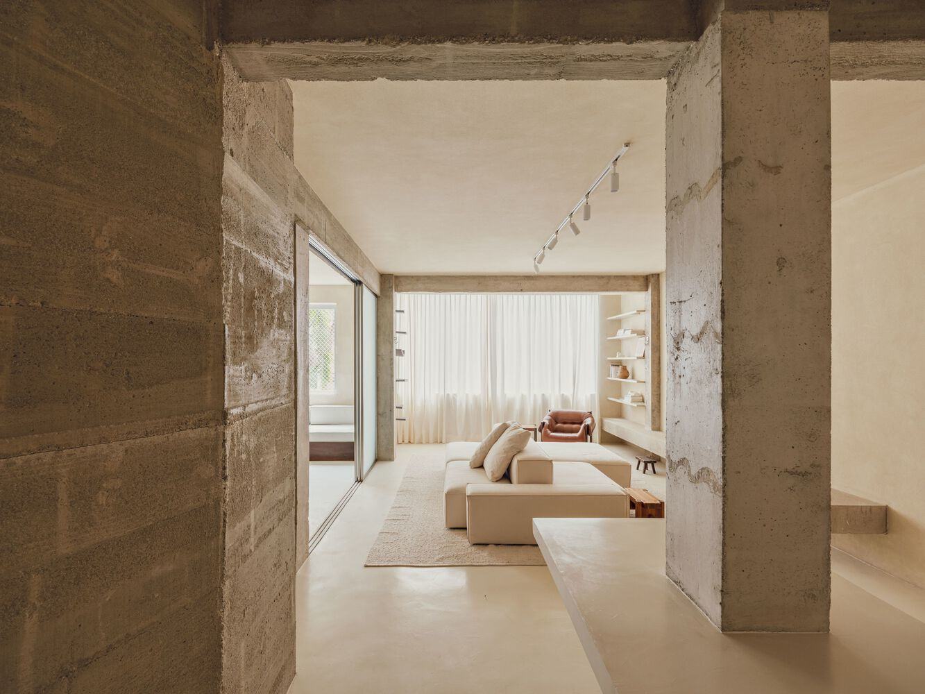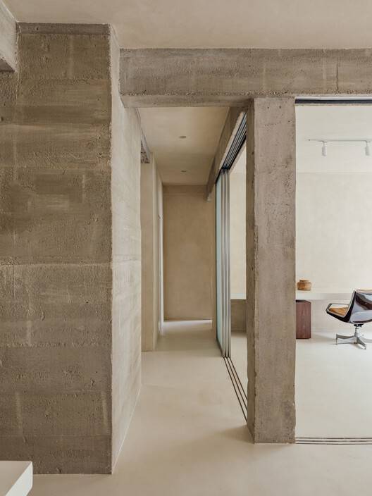As one of the premises of the studio is to inhabit the threshold between material and abstract, we decided to assume concrete beams and pillars, together with a large part of the furniture in stainless steel. This contrast between the raw and the refined seeks to evoke the surreal, dreamlike, and sculptural space. Both the continuous techno cement floor and the walls and ceilings in raw tones were designed to harmonize with the textures of the pre-existing concretes. Thus, the walls were covered with textured sand-colored paint, which gives an irregular and artisanal quality, being soft and sensitive to the touch, while visually evoking raw concrete. This result washes the interiors with a grayish-beige tone, aligning with the structure and transforming the environment into a "blank canvas," representing a scenario of present and future intervention possibilities.