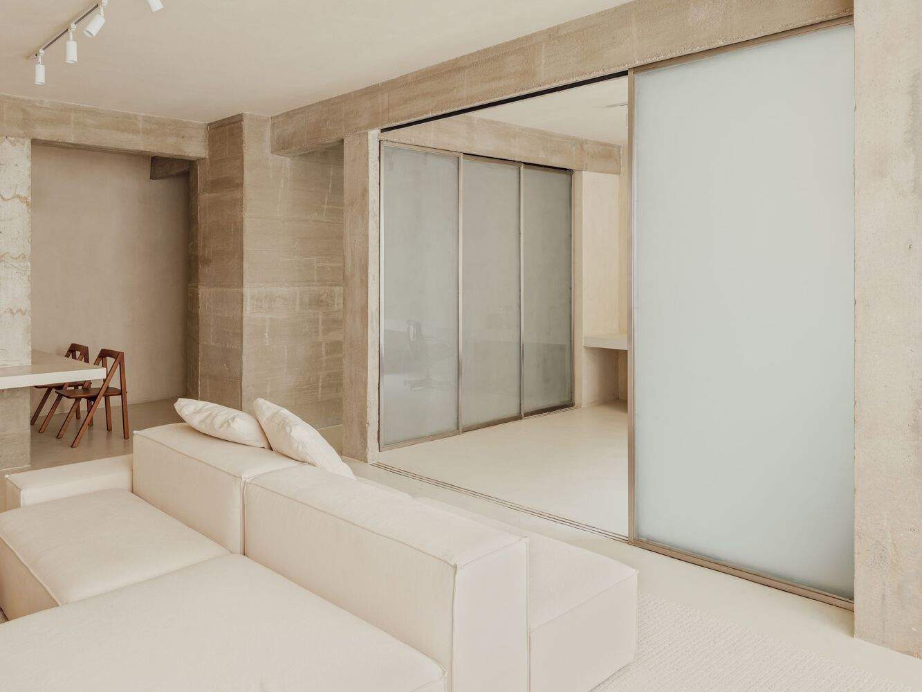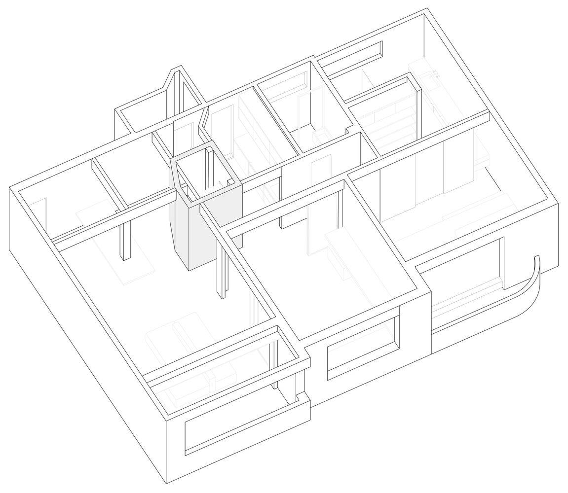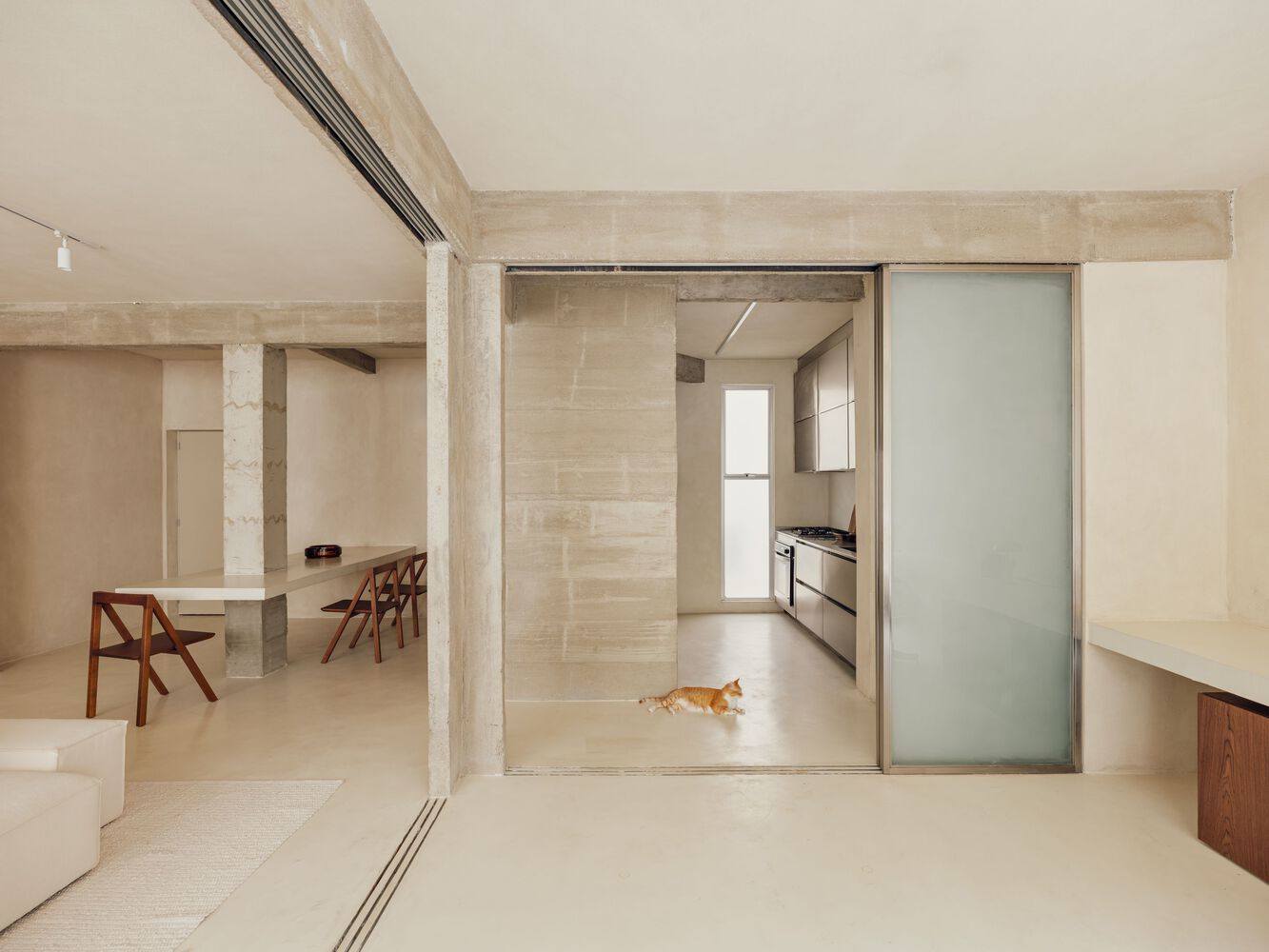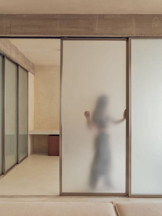 通过拆除公寓的墙壁,梁结构本身划定了空间,这些空间由滑动的磨砂玻璃门隔开,建立了一个抽象的背景,不仅反射光线,还反映了从另一侧投射的阴影的细微差别。公寓的多种配置允许关闭这些门以创建一个新的卧室,并完全打开它们,在客厅、办公室和厨房之间展现出一个完全整合的空间。