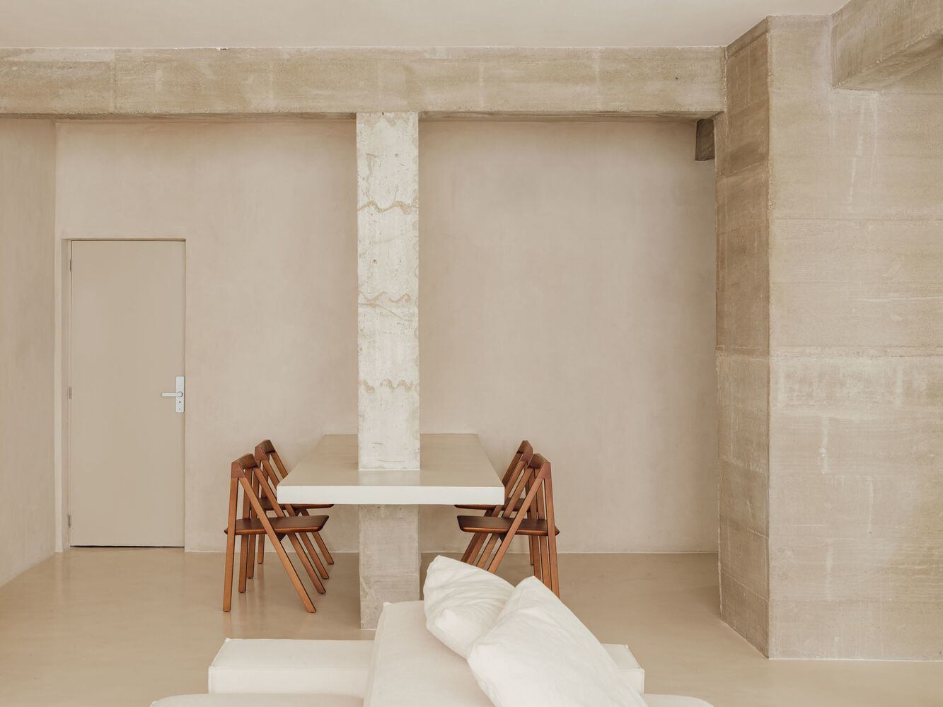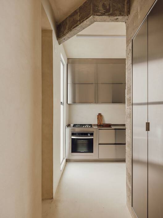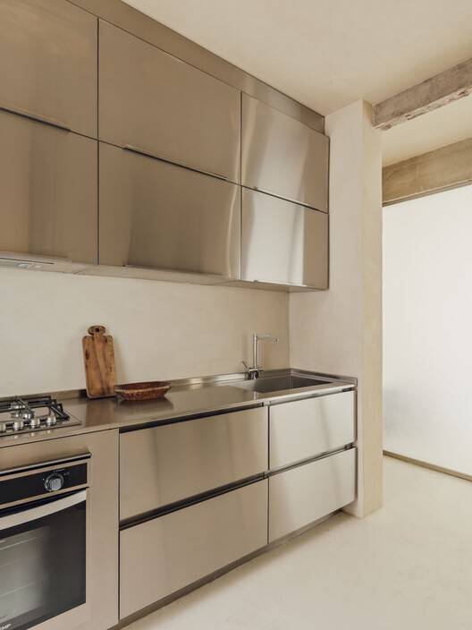 由于工作室的前提之一是居住在材料和抽象之间的门槛上,我们决定采用混凝土梁和柱子,以及大部分不锈钢家具。这种原始和精致之间的对比试图唤起超现实、梦幻和雕塑般的空间。连续的技术水泥地板和原始色调的墙壁和天花板都是为了与现有混凝土的纹理相协调而设计的。因此,墙壁上覆盖着纹理丰富的沙色油漆,这赋予了一种不规则和手工的品质,柔软且触感灵敏,同时在视觉上唤起了原始混凝土的感觉。这一结果用灰褐色色调清洗了内部,与结构对齐,将环境转化为“空白画布”,代表了当前和未来干预可能性的场景。
