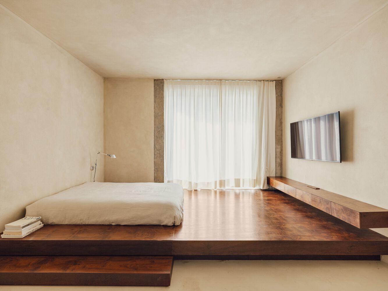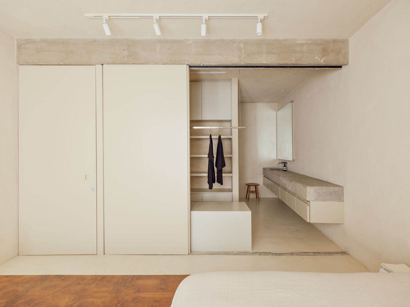 对所有空间整合的追求也反映在卧室中,卧室仅通过滑动门与壁橱和浴室隔开。浴室中宽阔的混凝土台面几乎从卧室开始,为壁橱、卧室和浴室的使用提供支撑,从而增强了整个公寓的完整性。