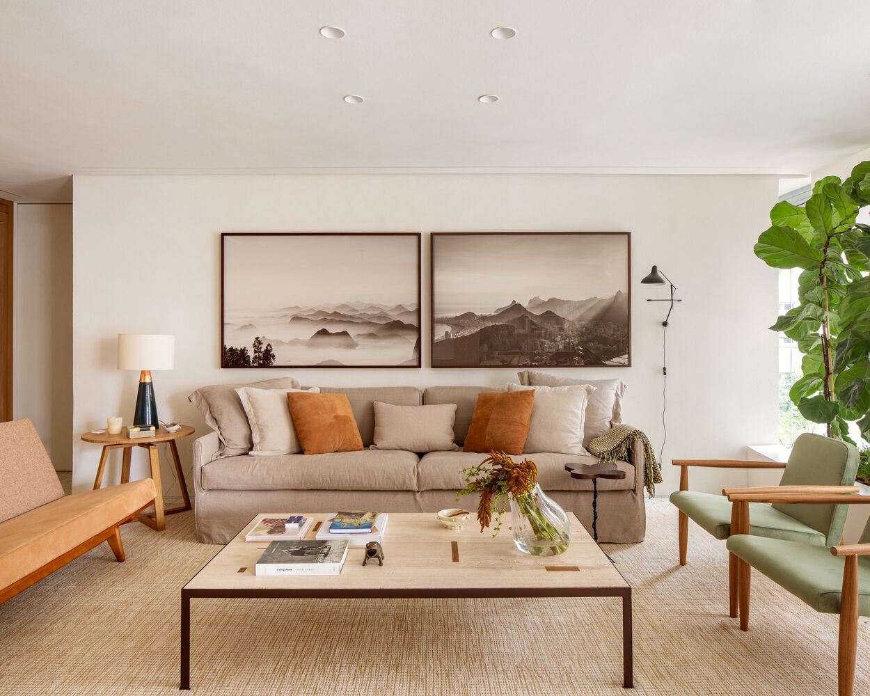 The choice of each piece of furniture resulted in a unique and original composition. In addition to the clients' and vintage pieces, the apartment features pieces designed exclusively and some by designers such as Sergio Rodrigues and Jean Gillon.