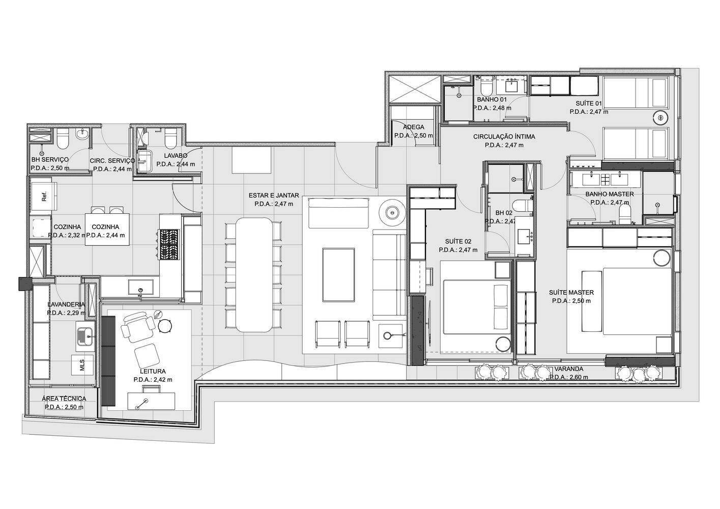 The desire to have vegetation inside the apartment led to the creation of a planter along the glass facade of the apartment, contributing to thermal and visual comfort. With an organic shape, the planter brings greenery indoors and provides space to sit and support objects.
