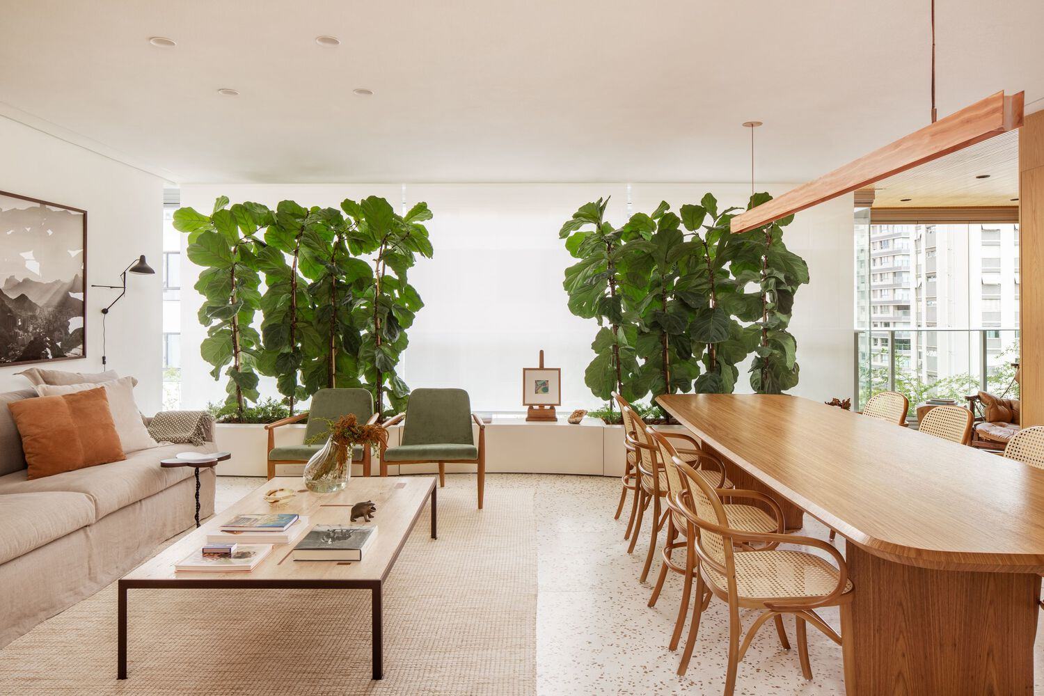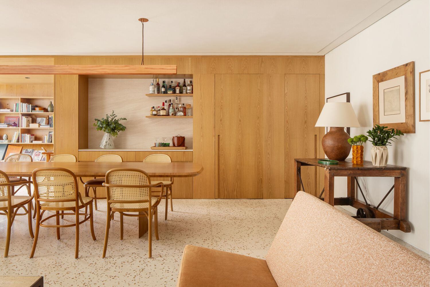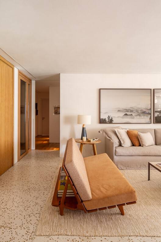 The terrazzo flooring takes center stage throughout the living area. To complement it, two materials were chosen for the walls: Carvalho wood panels and an off-white Terracor texture. The texture flows onto the ceiling of the room, creating a sense of unity and expanding the space.