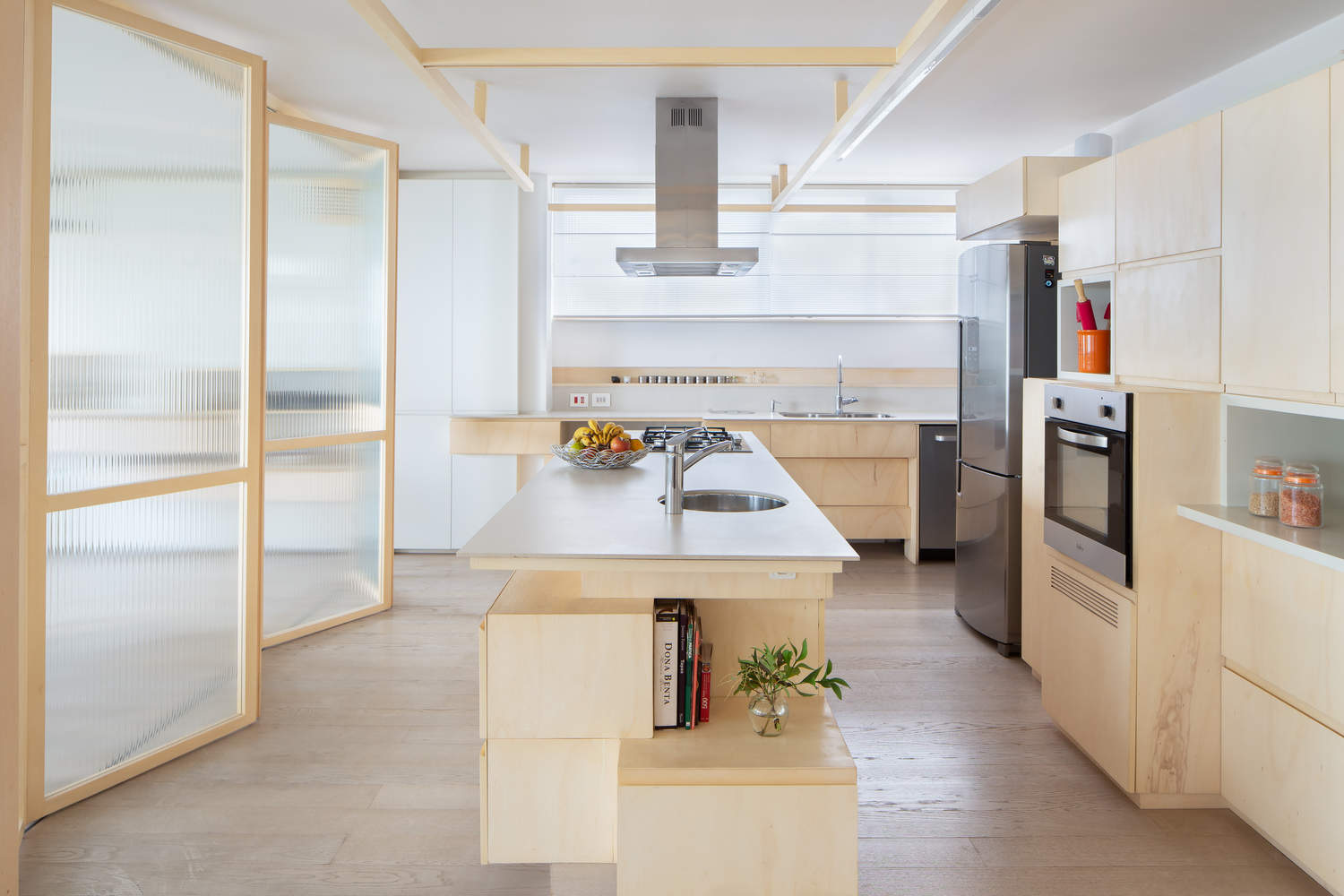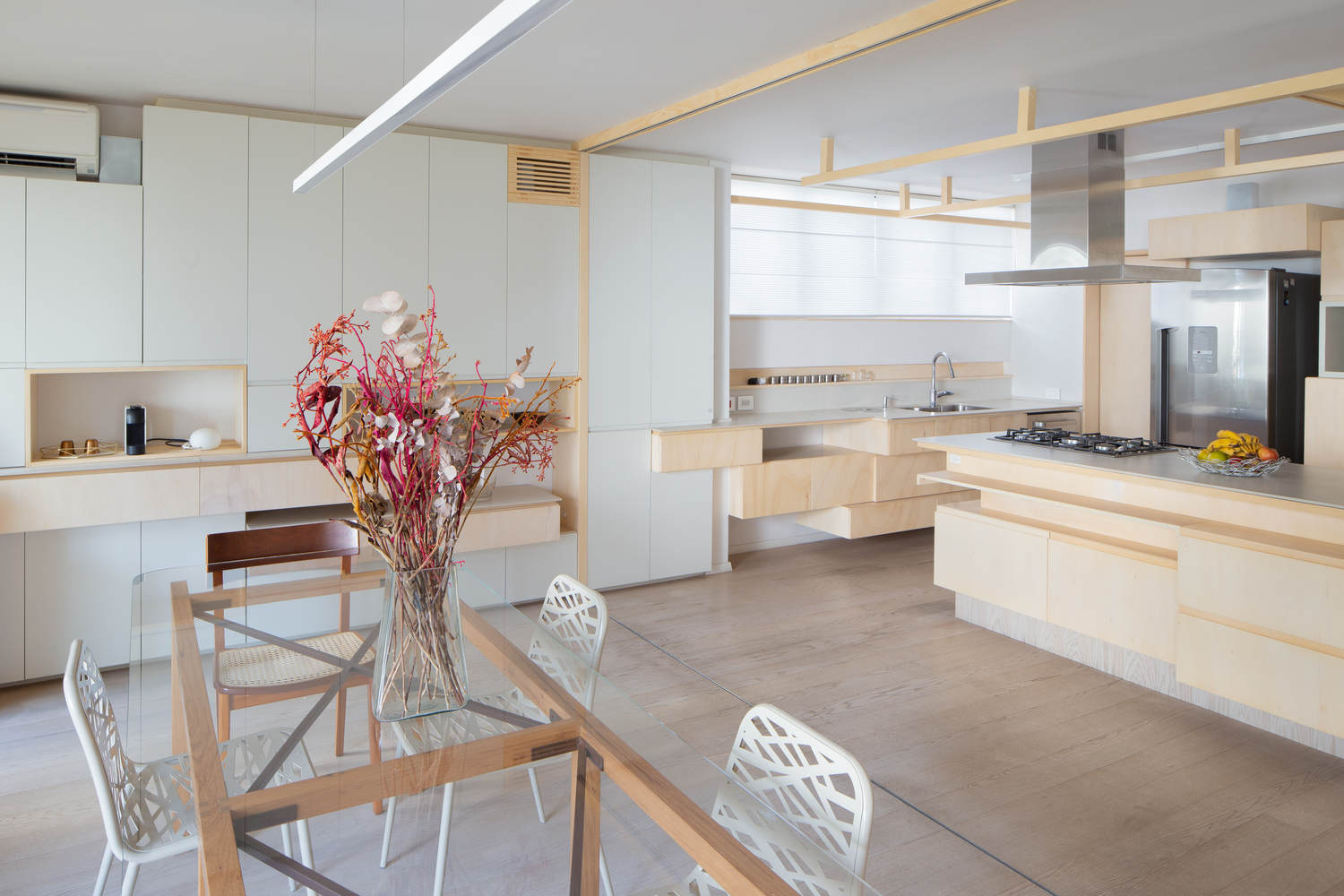 随着公寓的翻新,社交区已成为居民的大生活空间。厨房、餐厅、客厅和电视都与公寓的花园相连。重要的是要说,如果有必要,厨房可以通过旋转玻璃门与其他环境隔离开来,这些玻璃门允许光线通过,但阻挡了房间里人的视线。