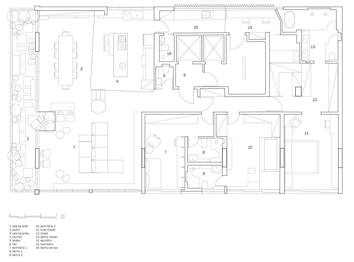 On the other hand, Shakkei could be translated as “borrowed scenery”, when the project uses elements of the background to compose the architecture and the landscape. In the balcony, we can see the treetop of a flamboyant, and the landscape project took it as the design concept to create a garden through all the balcony. It results in an arrangement between interior and exterior elements, as a vast green area inside an apartment on a complete urbanized zone of São Paulo.