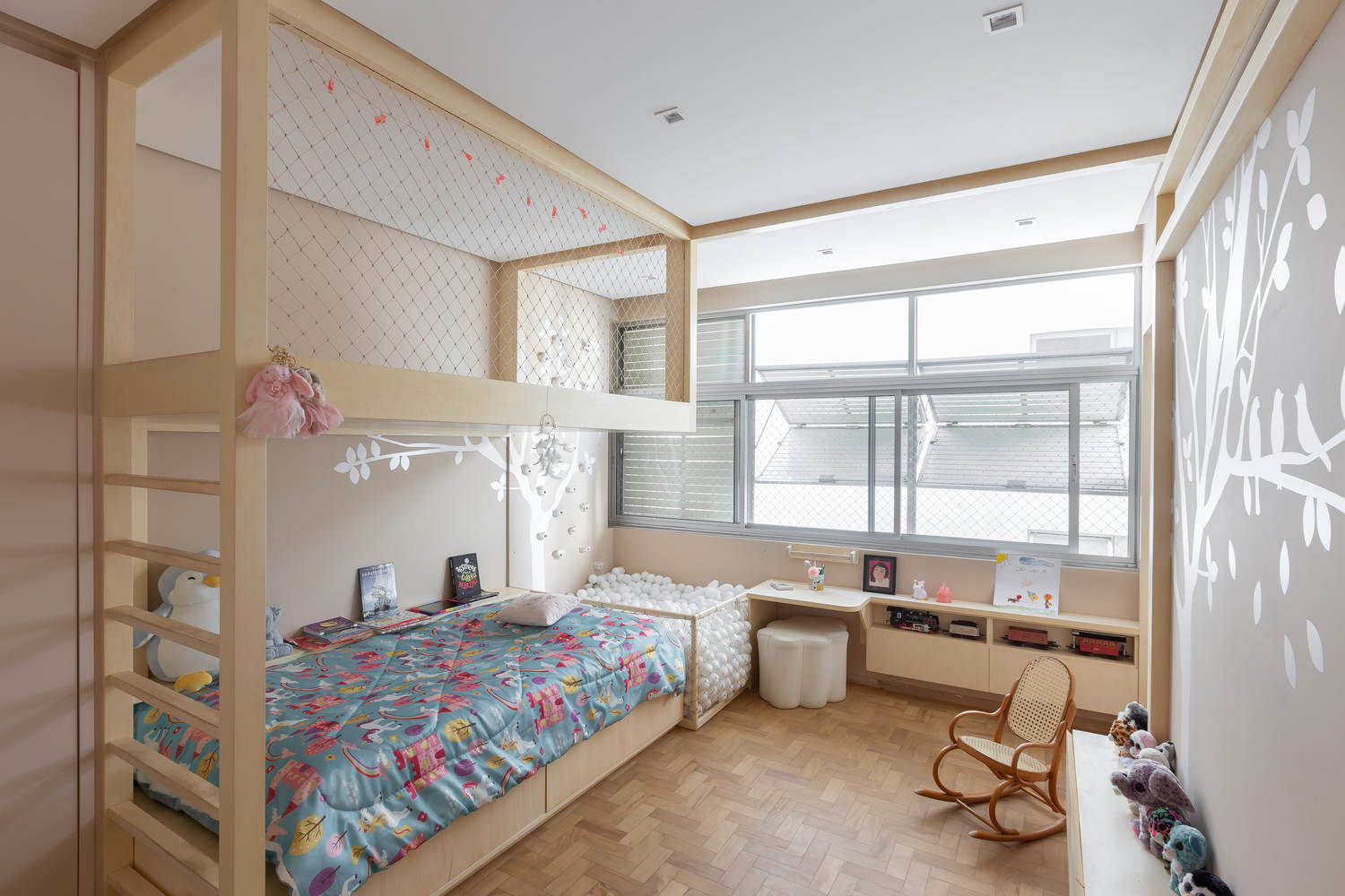 In addition to the design of the entire carpentry of the apartment, the office also designed some of the furniture present in the room, such as the sofa and the dining table. About the sofa, we can say that it was designed to become the center of integration and connection of the environment. It has multiple functions and can be used both for moments of relaxation and for moments of conversation and socialization. The table, on the other hand, has a joinery structure with mounting made in fittings, inspired by Japanese joinery. It has a simple and light design, adapting to the most diverse types of environments.