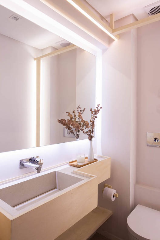 建筑师提供的文字描述这个项目的主要挑战是为位于圣保罗市中心的空间带来一种家的感觉,在那里可以始终与自然接触。因此,选择了使用自然纹理和增强自然光照,与花园中的绿色形成对比的浅色占主导地位。该项目是一个应用日本建筑元素的实验:轻构图、原材料的使用和它们自己的自然纹理,以及tsuboniwa和shakkeiText description provided by the architects. The main challenge of this project was to bring to the space located in a central area of São Paulo a house feeling, where the contact with nature can be always present. For this reason, the use of natural textures and the enhancement of natural lighting were chosen and light colors that contrast with the green present in the gardens are predominant.The project performed as an experiment to apply elements of Japanese’s architecture: a light composition, use of raw materials and their own natural textures, as well astsuboniwa andshakkeias the landscape concept.