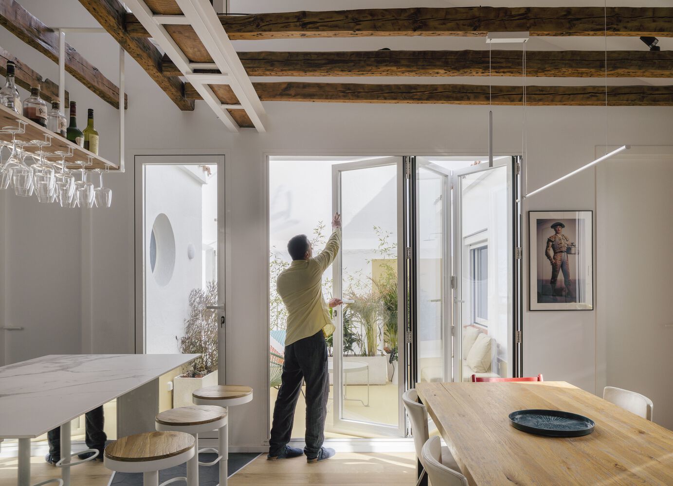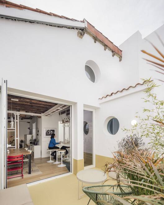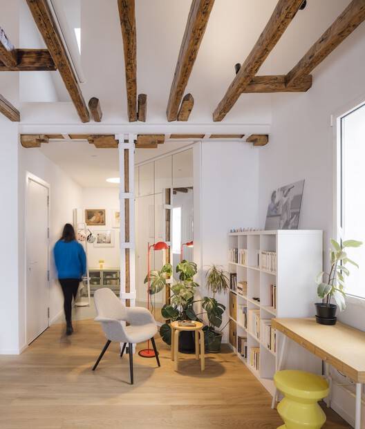 Far from being a drawback, this condition is enhanced and becomes an opportunity, starting to design, so to speak, the house through the roof. The alterations to the house are projected from the spatial and structural understanding of this particular cover in order to return to each of the spaces of the house, without exception, the prominence they had lost. And this is done, first, by restoring it with metal reinforcements, and then practicing a series of strategically placed perforations to introduce natural light and ventilation in order to experience more deeply the reflections of the air, that is, ultimately, the passage of time. The restructuring undertaken under the roof replaces a dark space compartmentalized in small rooms and corridors with a more luminous and fluid one; an exterior that defines an interior; a new landscape and domestic volume that is revealed through variable heights and changing light, and that overturns and relates each and every one of the rooms with the unique Velázquez sky of Madrid.The interior of the house, which runs lightly under that great roof of sloping planes, wooden beams and skylights, is projected and defined as a continuous space with loosely defined, indeterminate limits between public and private. Only the changes in flooring, from wood to ceramic, mark both the program and the use of space in each room.The domesticity is articulated and designed considering the coexistence and different simultaneities in the day to day, as a set of large rooms where the daily actions of each of the members of the household, both individual and collective, take place.