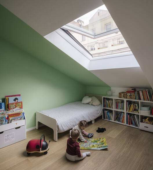 “法国家庭正在寻找一套公寓,在马德里无限期定居”。2022年底,Marion和Paul Franck夫妇在工作室里展示了自己,他们有三个年幼的孩子——Leo、Romeo和Zöe。在此之前,由于他在航空业的工作,他们在图卢兹生活了五年,在留尼旺岛又生活了两年,一个在华盛顿,最后四个在伦敦。与之前的目的地不同的是,马德里现在似乎是他们选择永久定居的地方。他们通过在马德里市中心Gran Vía和Chueca附近的Justicia社区购买了一栋位于20世纪初建造的住宅楼顶层的151平方米的住宅来实现这一目标。这座住宅具有明显的纵向特征,平面图围绕三个庭院组织,矛盾的是,尽管是一套顶层公寓,但它并没有与周围的城市轮廓建立明显的联系。相反,它就像犰狳的外壳一样,是封闭的,不受外界的影响。为此,它有一个广阔的屋顶:一个200平方米的波浪形不透明瓷砖表面,由7个不同坡度和长度的屋顶组成,由一个木梁框架组成,其中许多木梁变暗,状况不佳,隐藏在假天花板后面。