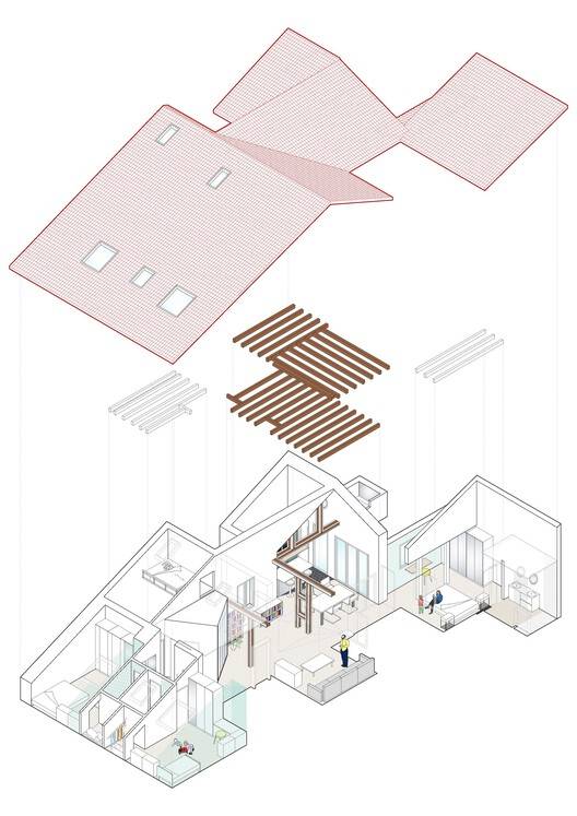 这远非一个缺点,而是一个机会,可以说,开始设计穿过屋顶的房子。对房屋的改造是根据对这一特定覆盖物的空间和结构理解进行的,目的是毫无例外地回到房屋的每个空间,恢复它们失去的突出部分。首先,通过金属加固来修复它,然后练习一系列战略性的穿孔,以引入自然光和通风,从而更深入地体验空气的反射,即最终的时间流逝。在屋顶下进行的重组将分隔在小房间和走廊中的黑暗空间替换为更明亮、更流畅的空间;定义内部的外部;通过可变的高度和不断变化的光线,展现出一种新的景观和家庭空间,将每一个房间都与马德里独特的委拉斯开兹天空相联系。房子的内部在斜面、木梁和天窗的大屋顶下轻轻延伸,被投影和定义为一个连续的空间,在公共和私人之间有着松散、不确定的界限。只有地板的变化,从木材到陶瓷,标志着每个房间的程序和空间的使用。家庭生活是考虑到日常生活中的共存和不同的同时性而表达和设计的,作为一组大房间,家庭中每个成员的日常行为,无论是个人还是集体,都在这里发生。