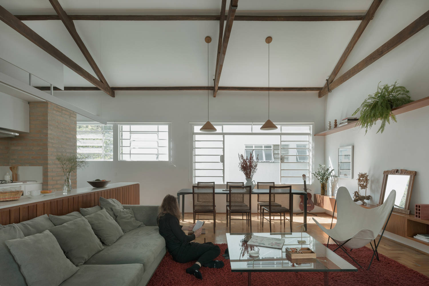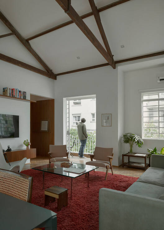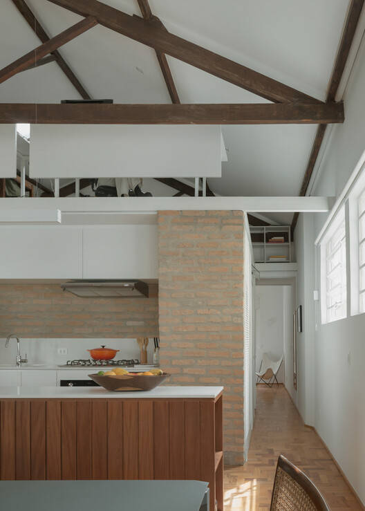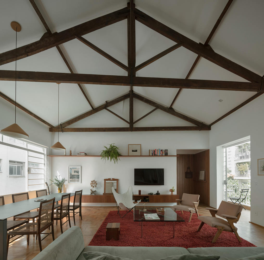 设计理念与空间布局:Cravinhos公寓项目最引人注目的地方在于其对“家”的定义。设计师通过对原有结构的处理,巧妙地将公寓转变为更具居住感的空间。核心在于保留和利用了四水桁架木屋顶的结构,强调了其手工工艺的价值。同时,通过创造新的基础设施核心,包括厨房、浴室等,重新定义了空间的使用和流线,并在保留原有结构的同时,引入了自然光和交叉通风,增加了空间的舒适性和居住体验。项目巧妙地利用了建筑的优势,使其与城市环境紧密结合,创造出独特的居住感受。