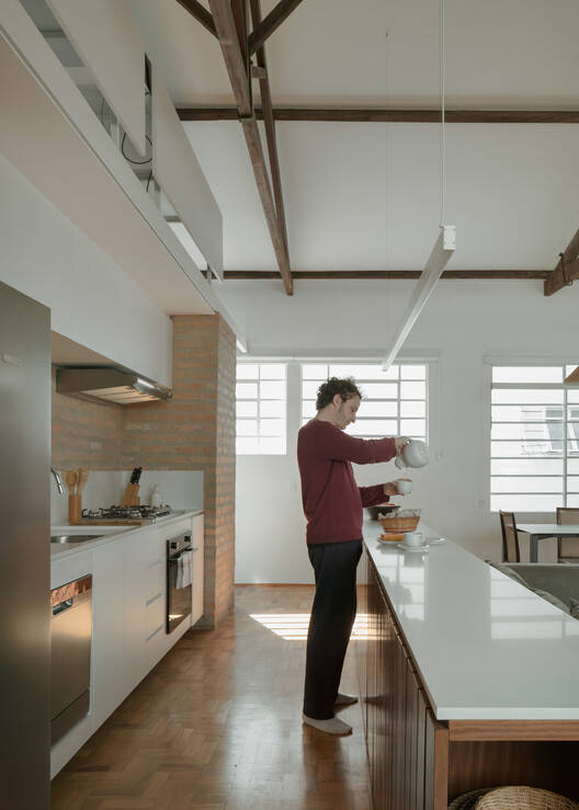 为了突出这次遭遇,灰泥被拆除,部分粘土砖砌体被重新使用,以建造一个新的基础设施核心,包括厨房、两间浴室、洗衣房和一个壁橱。为了确保自然光和交叉通风,整个公寓与公寓的周边和屋顶分开,围绕着这个元素旋转,在这个元素上还放置了一个金属结构,为工作空间创造了一个夹层。