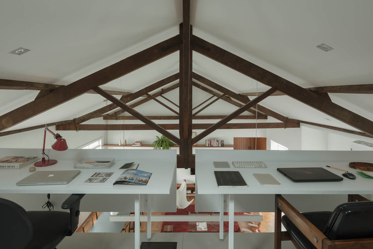 It is typical for an interior design project to encounter unexpected elements during its renovation. On the top floor of the Cravinhos Building, we encountered a four-water-trussed wooden roof, with carved joints and tie rods, a level of craftsmanship that only handwork could achieve.