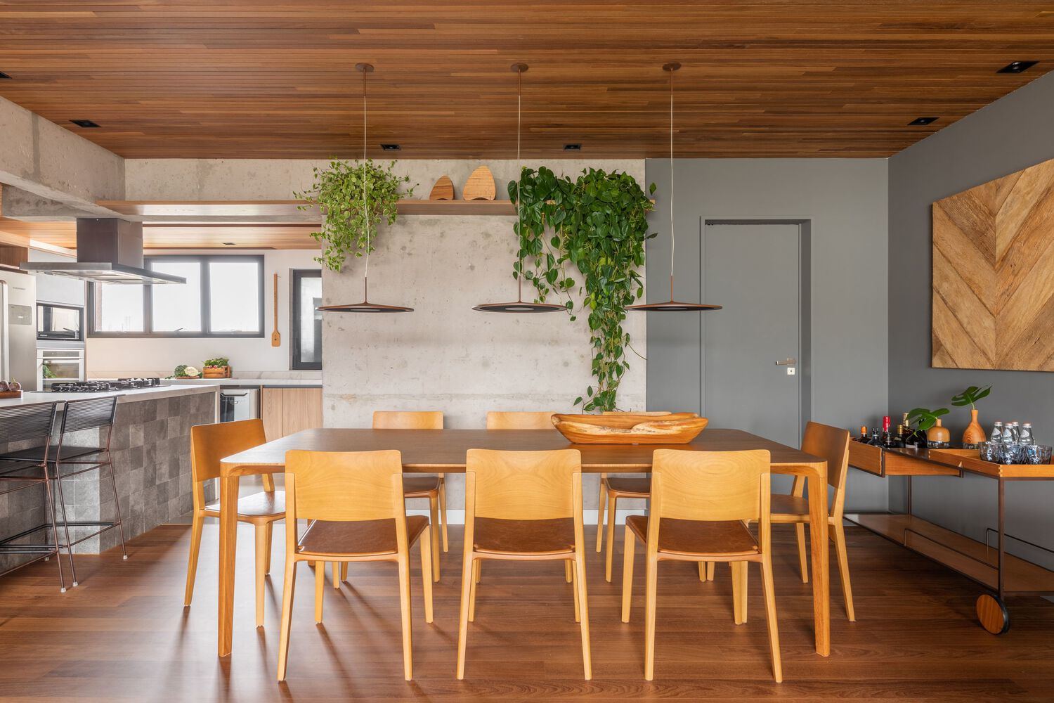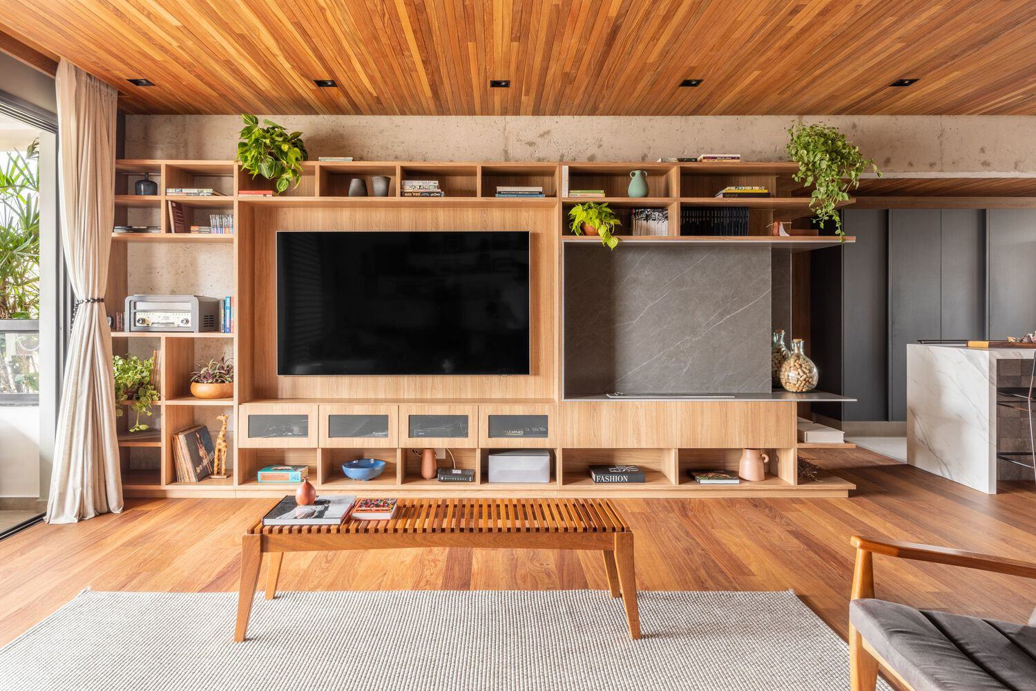 他以创造性的眼光彻底翻修了这个空间,将地板、墙壁和天花板饰面的木材与该物业的结构元素(如外露混凝土中的梁和柱)融合在一起,营造出温暖而现代的精致感。