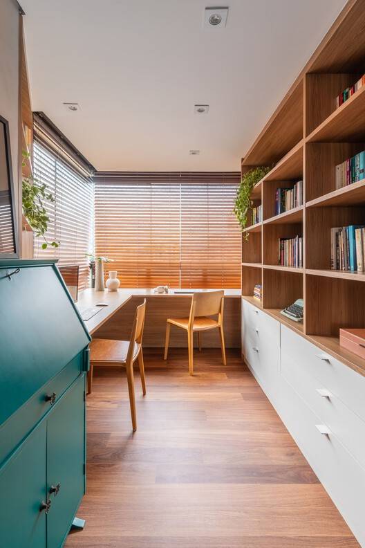 In the office, Mandorla wood makes its presence felt on the desk and the shelf of the workspace, executed by SCA Jardim Europa. The white MDF drawers give a light and subtle air to the space, and the large window, which runs along the entire length of the desk, allows for great natural lighting for visual comfort during professional activities.