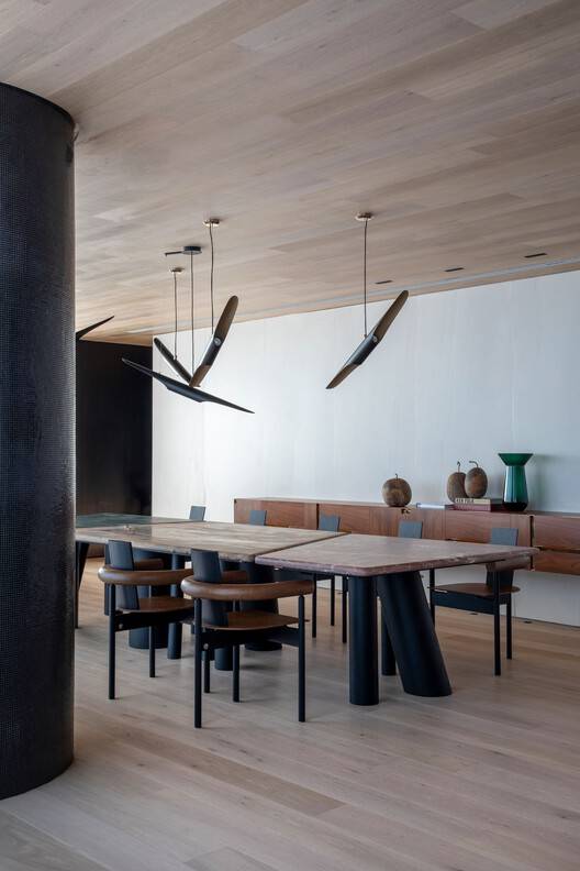 材质运用的精髓:项目的精髓体现在对材质的巧妙运用和对比之中。设计师大胆地将欧洲橡木与玄武岩这两种截然不同的材质相结合,创造出一种微妙而复杂的视觉效果。橡木的轻盈和温暖,为社交和私密区域带来了舒适感;而玄武岩的坚硬和冷峻,则为空间增添了一丝现代气息。此外,黑木在入口大厅的使用,营造出一种光影交错的诗意氛围,引导居住者进入温馨的居住空间。这种对材质的精细掌控,不仅提升了项目的质感,也赋予了其独特的个性,完美地诠释了设计师的设计理念。
