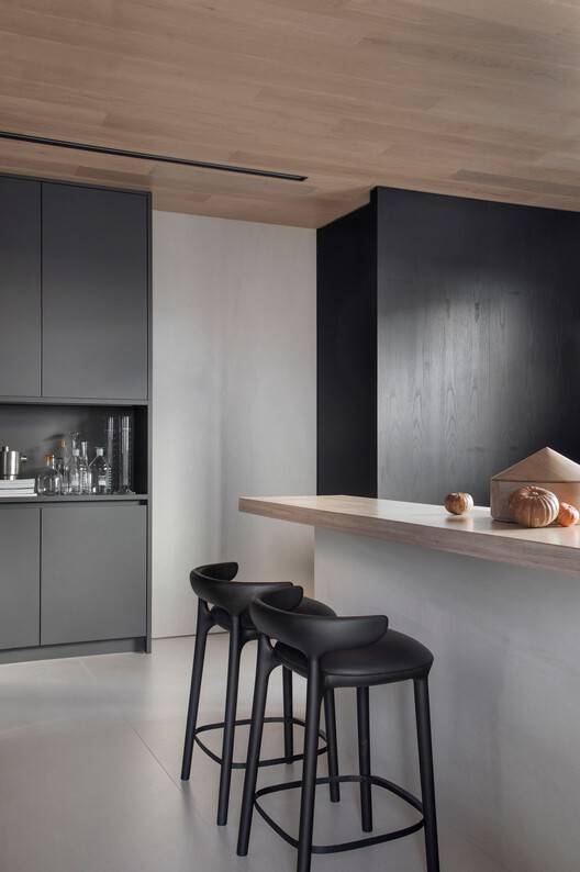 The service area is located at the back of the apartment, housing the kitchen, a half bath, and a wine cellar. The project intriguingly approaches materiality, using two opposite materials that connect and integrate in a subtle and sophisticated manner. European oak wood, is a light and soft material, in contrast with Basaltina stone, a harder material. Wood was mostly used in the intimate and social zones, aiming to maintain comfort.