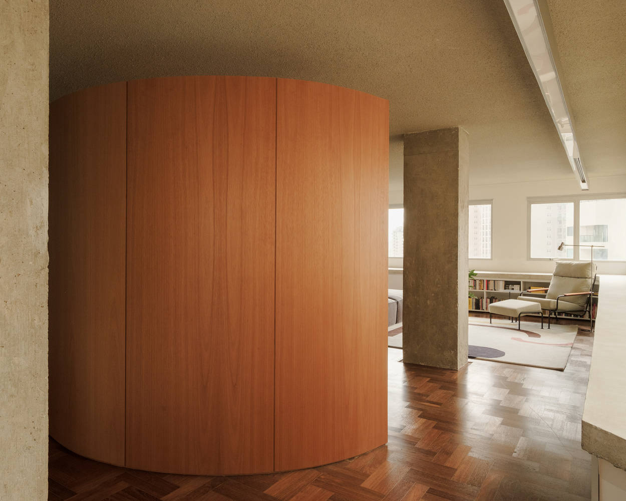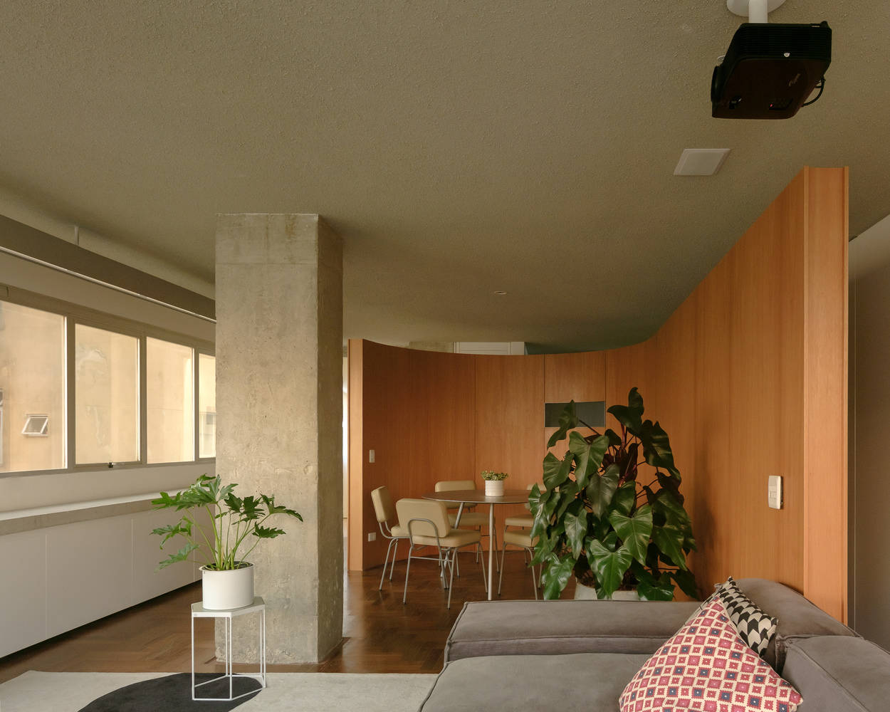 On the other hand, the materiality of the spaces received a new approach. The curved wall that surrounds the dining and living room has had its top detached from the ceiling and has been finished in tauari wood panels. A discreet passageway was opened in it, connecting it to the kitchen. The amber film on the windows has been maintained, so that the living spaces are illuminated by a soft warm color, amplified in the satin white planes and wooden furniture and the elements designed in anodized aluminum, such as the suspended linear lamp and the dining table.