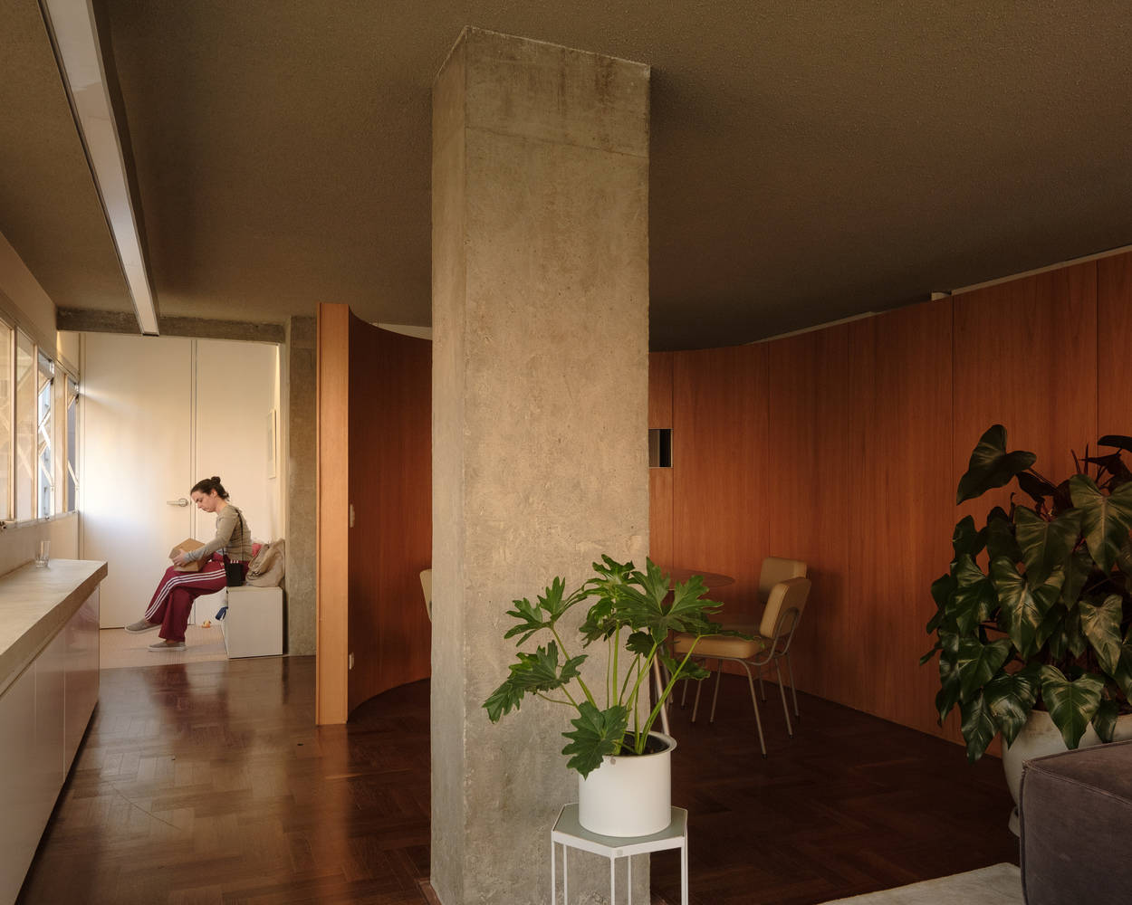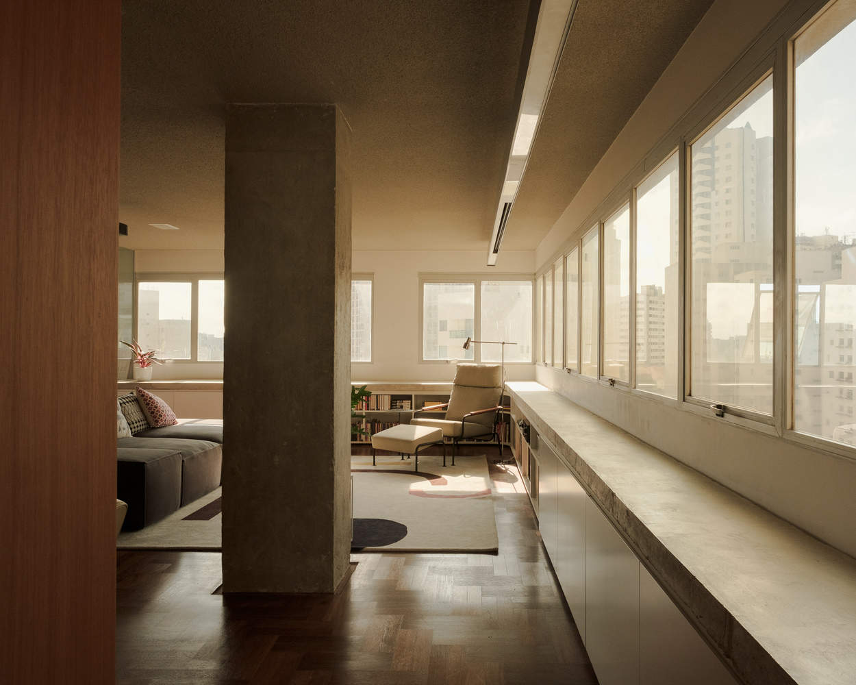A white concrete slab runs along the edges of the living room and office, reappearing in the bar worktop. A rough texture was applied to the ceiling, a reminder of the domestic ambiance of São Paulo architecture from the period of the original project. The kitchen and laundry room received stainless steel worktops and light-colored furniture, contrasting with the rest of the apartment. On the intimate balcony, which can only be accessed from the bedrooms, there are pink ceramic tiles and smooth benches for fun activities. These are welcoming spaces that filter and soften the pulse of the bustling metropolis around them.